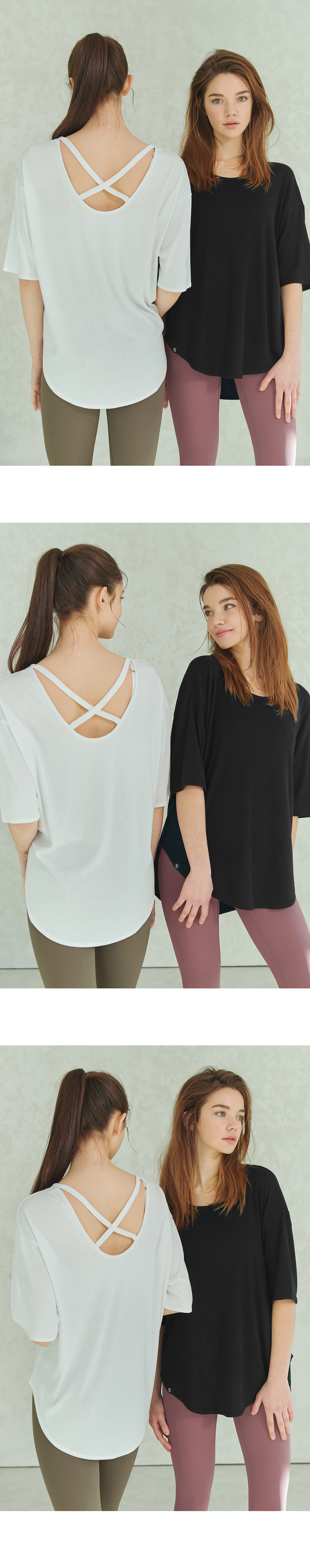 어깨선을 여유 있게 디자인한 루즈한 핏에 백 라인에 포인트를 더한 숏 슬리브 티셔츠예요. 부드러운 고밀도 레이온에 폴리에스터의 폭신한 촉감을 더해 쫀쫀하면서도 복원력이 좋은 텐션감을 구현하여 간절기 애슬레져 티셔츠에 적합한 소재예요. 뒷 넥 라인은 제원단 스트랩으로 X자 포인트를 주어 유니크하면서도 여성스러운 분위기를 연출해 줘요. 전체적으로 넉넉한 루즈핏 라인이 밑으로 떨어질수록 자연스럽게 드레이핑 되어 체형을 커버해 주고, 앞, 뒤 기장에 편차를 준 라운딩 밑단이 더욱 길어 보이는 다리 라인을 만들어 줘요. 착용 시 오른쪽 밑단에 젝시믹스 라벨을 넣어주어 스포티한 브랜드 아이덴티티를 보여 줘요. 가벼운 운동 시 탑 위나 레깅스에 가볍게 매치하여 코디해도 좋고 데일리 웨어로도 편안하게 즐길 수 있는 아이템이에요.