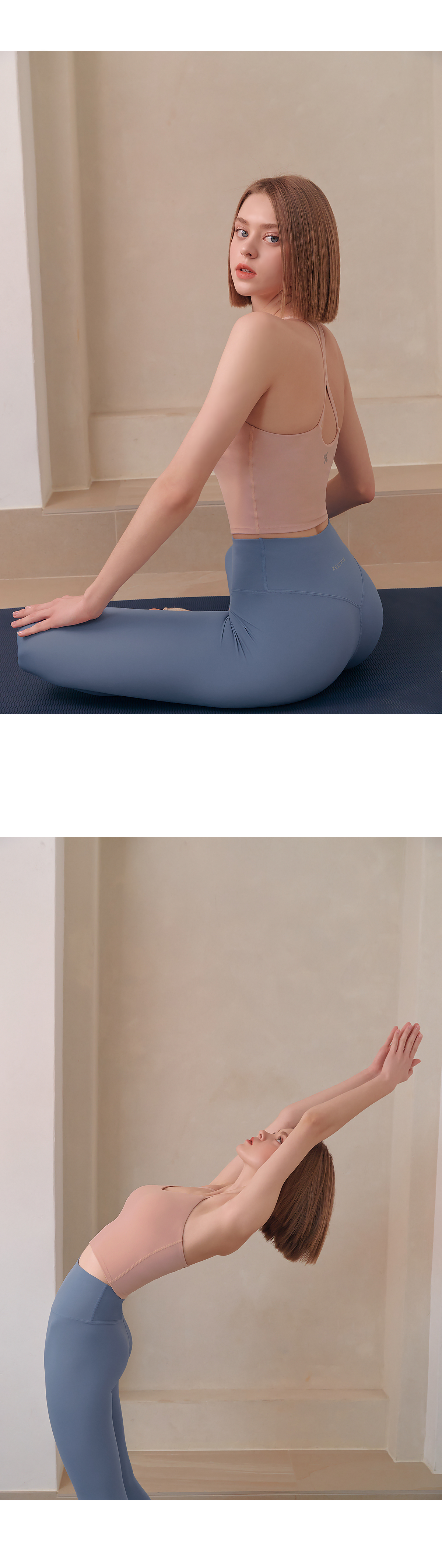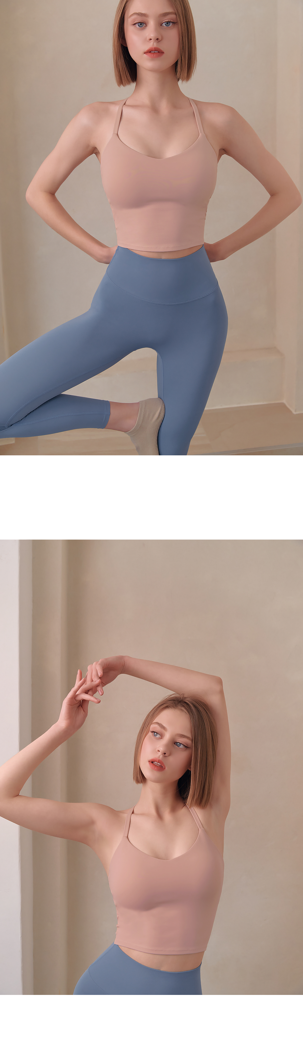 코튼과 같은 부드러운 촉감의 고급 요가복 소재인 나일론 스판을 활용하여 땀을 빨리 흡수하고 건조해 주어 활동적인 운동 시에도 쾌적하게 착용할 수 있어요.