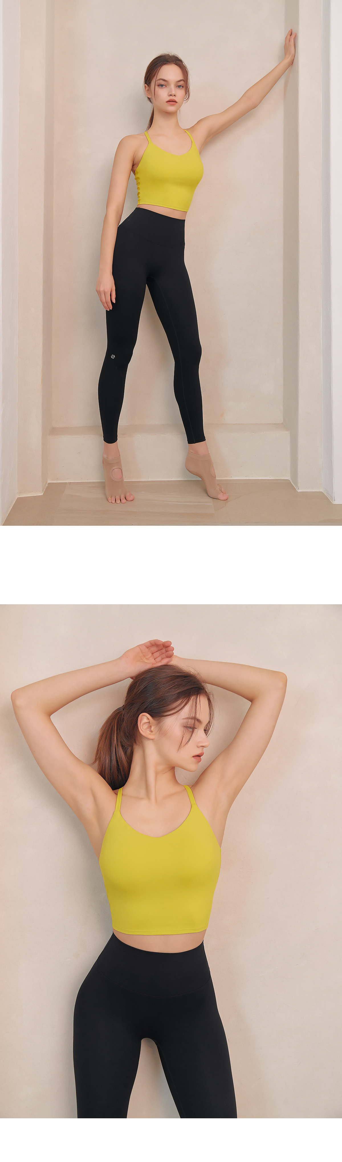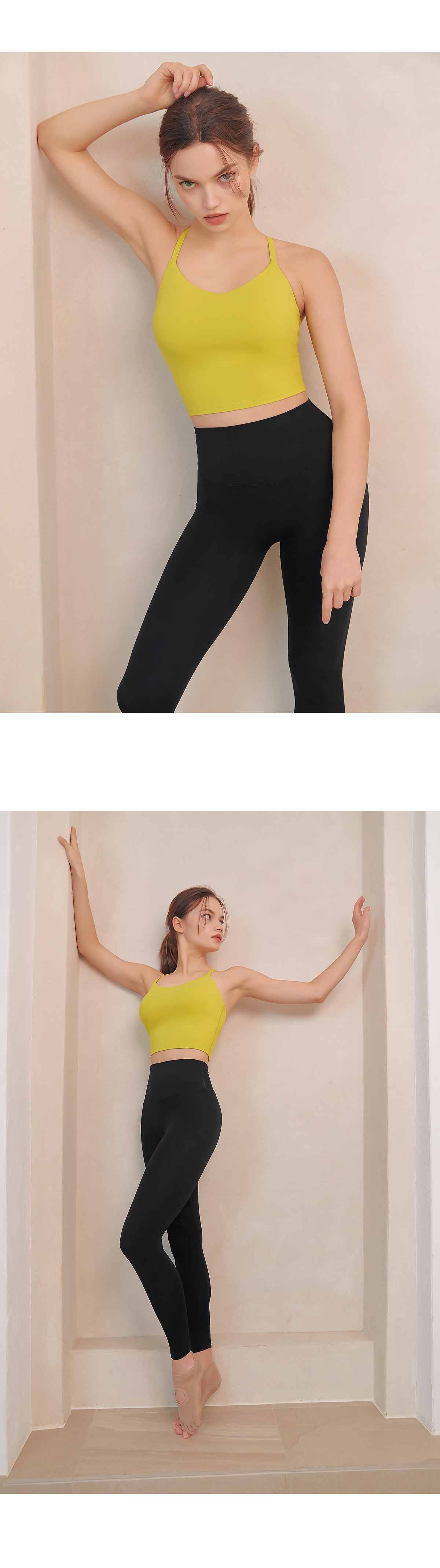 코튼과 같은 부드러운 촉감의 고급 요가복 소재인 나일론 스판을 활용하여 땀을 빨리 흡수하고 건조해 주어 활동적인 운동 시에도 쾌적하게 착용할 수 있어요.