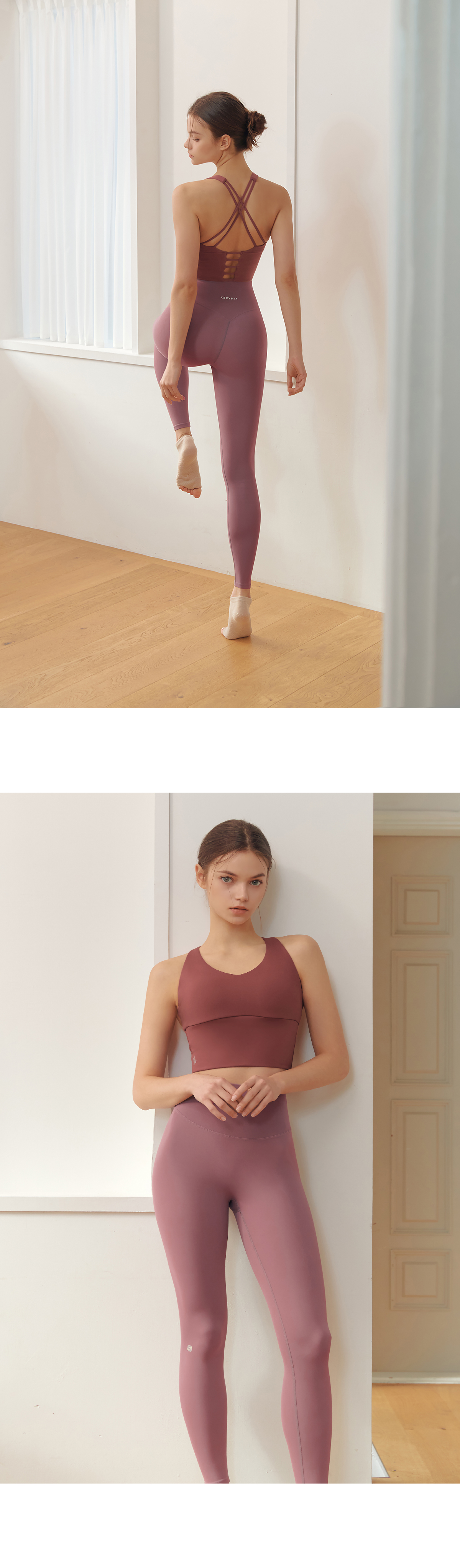 뒷판은 견갑골 라인이 드러나도록 스트랩을 교차시켜 등의 근육을 움직이는 액티브한 모션을 편안하게 움직일 수 있도록 도와주고, 밑단을 연결하는 5줄의 통끈이 바디 라인을 더욱 탄력적으로 잡아줘요.