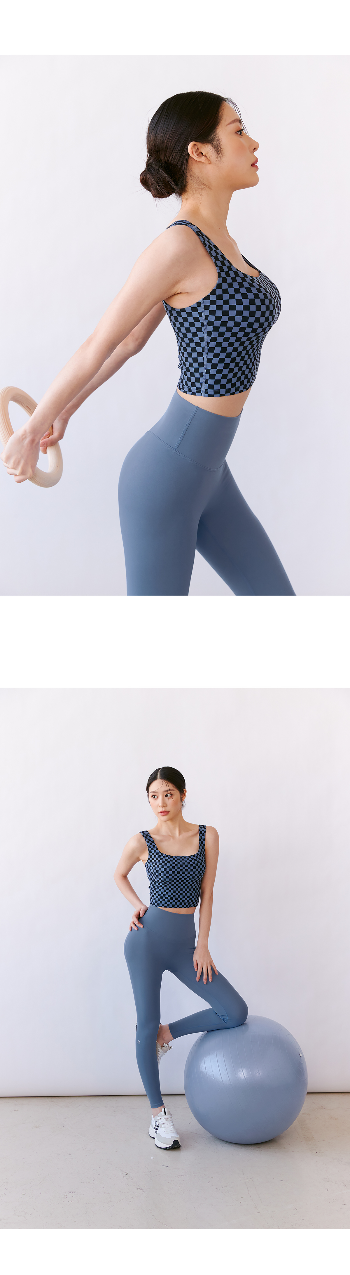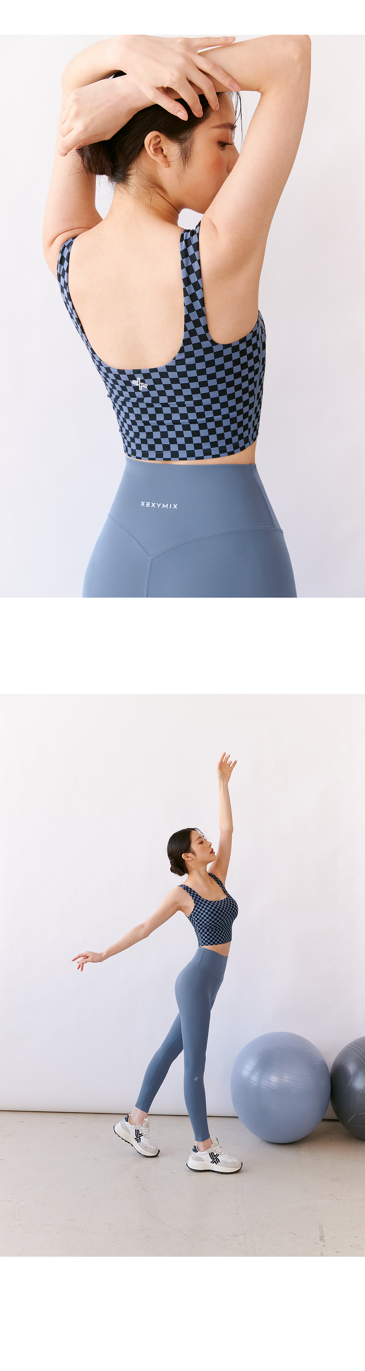 편안한 코튼 터치 액티브 웨어 소재인 젤라 원단에 깅엄체크를 기반으로 한 체커보드 패턴을 더한 브라탑이에요.