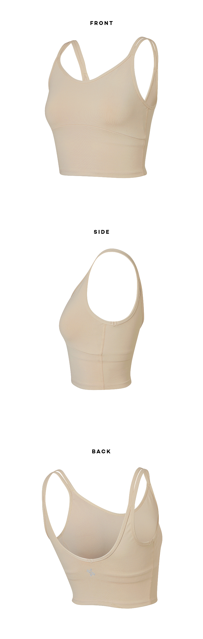 편안한 코튼 터치 액티브 웨어 소재인 젤라 원단에 베이직한 디자인에 스트랩 디테일을 더한 브라탑이에요. 젤라는 뛰어난 내구성과 살에 닿는 촉감이 부드러운 소재로, 땀을 빨리 흡수하고 말려주어 운동이 끝난 뒤에도 쾌적함을 유지해 줘요. 두줄 스트랩으로 바스트를 편안하게 지지해주고, 암홀 라인의 내장된 얇은 테잎이 들뜸 없는 핏을 완성해 줘요. 바스트 라인 아래 곡선으로 절개선을 넣어 자연스러운 볼륨감을 보여주고, 한층 더 얇은 허리라인을 연출해줘요. 백은 U라인으로 깊게 파여있어 여성스러운 무드를 연출해 주면서 등 근육의 움직임을 쉽게 관찰할 수 있어요. 허리선에 밀착되는 핏으로 슬림한 아웃핏을 완성해주고 부담스럽지 않은 크롭 기장으로 하이웨이스트 레깅스나 조거 팬츠와 스타일리시하게 매치할 수 있어요.