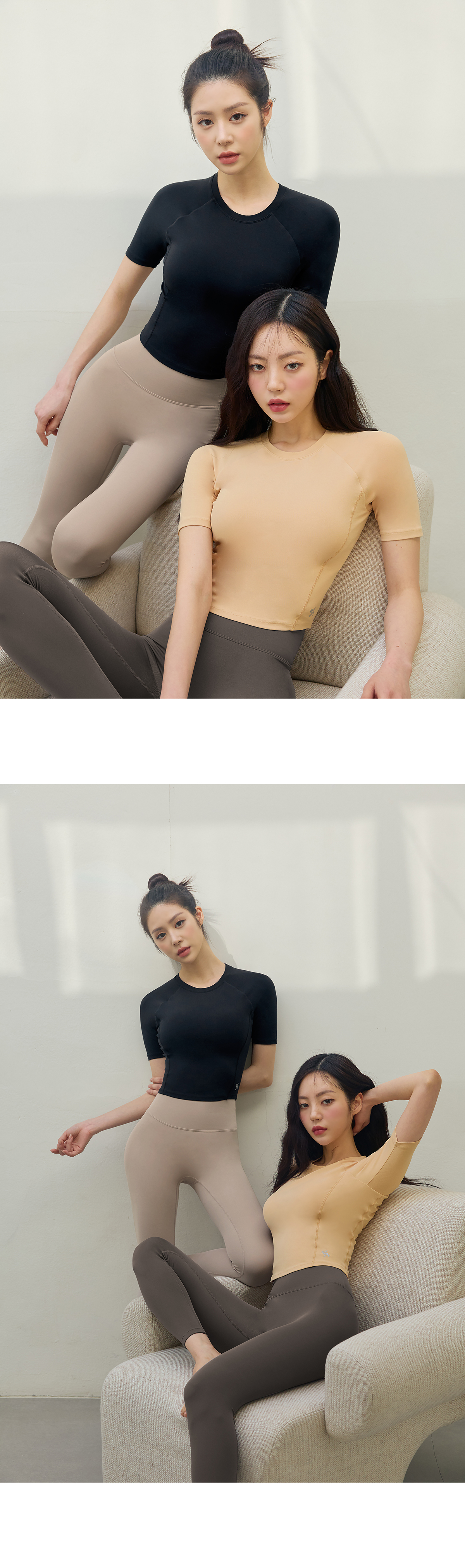 쇄골 라인을 따라 깔끔하게 떨어지는 라운드넥 디자인에 래글런 어깨 라인으로 팔을 들어 올리는 동작이나 액티브한 활동 시에도 편안하게 움직일 수 있도록 도와줘요.
