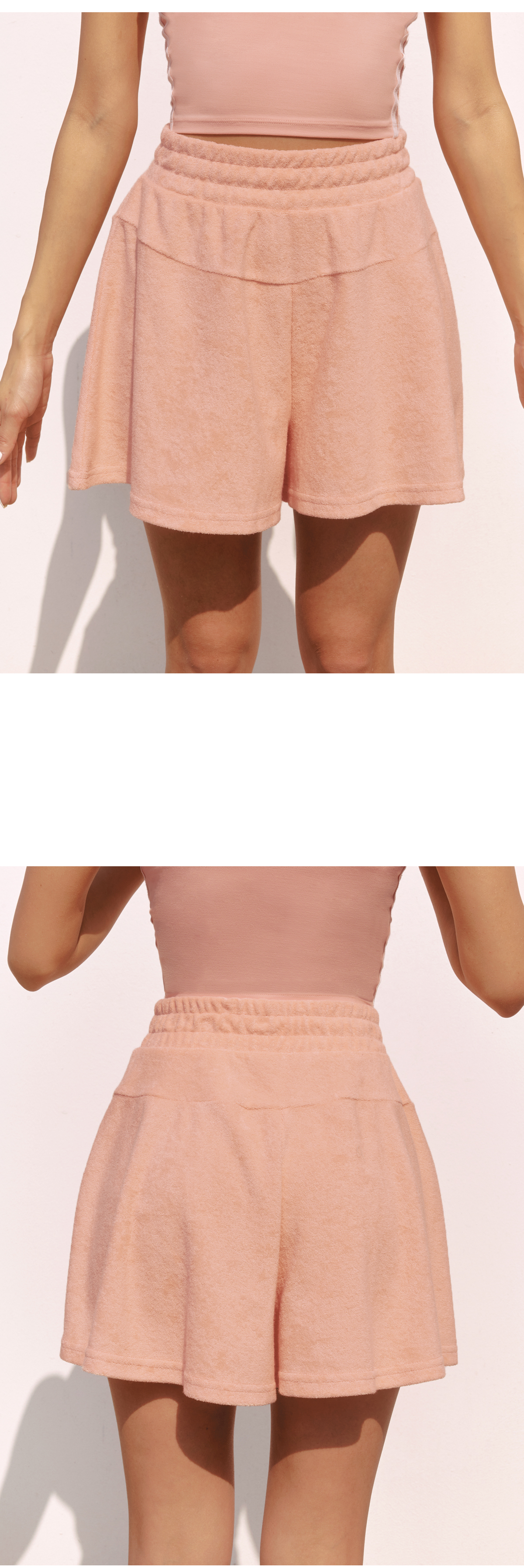 여유로운 루즈핏, 풍성한 실루엣의 테리 플레어 쇼츠예요. 베이직한 나이트네이비, 웜샌드 컬러부터 상큼한 캔디피치, 오펄민트까지 취향에 따라 고르기 좋은 컬러로 구성됐어요. 톡톡한 코튼테리 소재는 피부에 닿는 느낌이 타월처럼 부드럽고, 흡습성이 좋아 여름철 물놀이 활동에도 적합해요. 앞뒤의 요크선 디테일이 더 풍성한 플레어 실루엣을 연출해주어 움직임이 편안하고, 체형을 더 자연스럽케 커버해줘요. 허리선에는 신축성이 우수한 밴딩소재로 압박없이 편안하게 착용할 수 있고, 안쪽의 내장된 스트링으로 체형에 맞게 사이즈를 조절할 수 있어요. 세트 상의인 XA5386G테리 후드 재킷과 셋업으로 연출하면 더 귀엽고 매력적인 애슬레저 룩 완성! 심플한 디자인에 데일리로 활용하기 좋은 테리 플레어 쇼츠와 매일 편안한 휴식 같은 시간을 만들어 보세요.