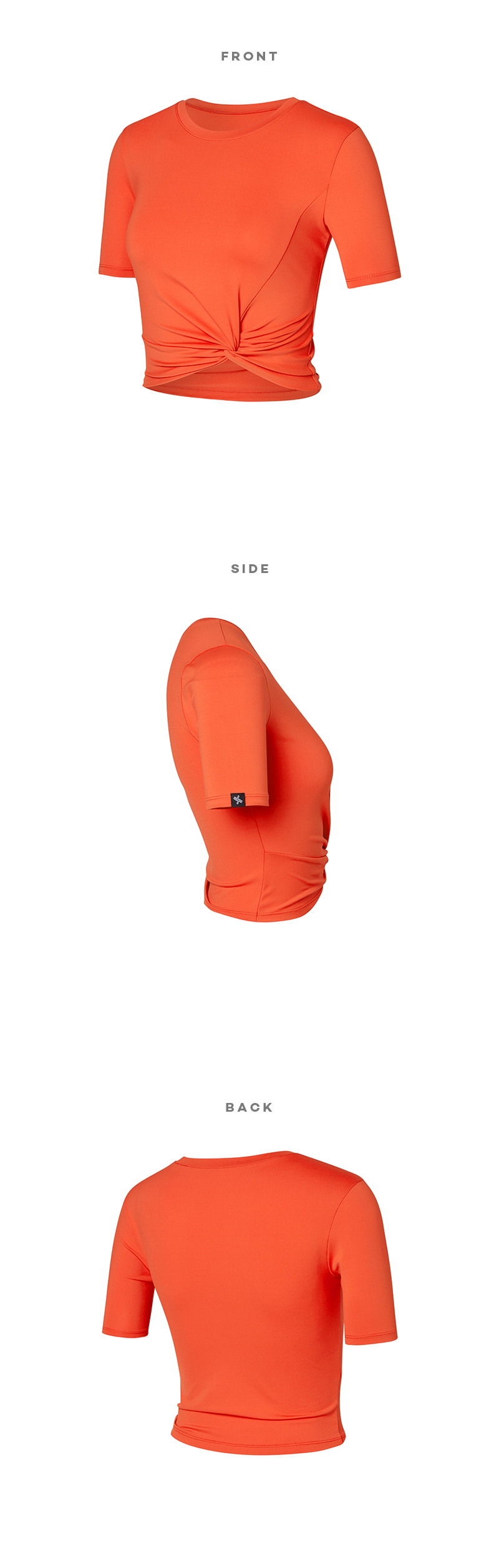 베이직한 라운드 넥 라인에 꼬임 디테일로 슬림한 허리라인이 돋보이는 크롭 숏슬리브예요. 더욱 업그레이드된 냉감 기능성과 UV 차단 기능이 야외활동 시에도 피부를 보호해 주고, 쾌적하게 착용할 수 있어요. 또 원단의 신축성이 있어 활동적인 퍼포먼스 시에도 편안한 움직임을 도와줘요. 체내의 땀을 빨리 방출하고 원단의 수분을 빨리 말려줘 언제 입어도 쾌적한 착용감을 유지해줘요. 밑단에 꼬임 디자인 포인트가 우아하고 유니크한 포인트를 만들어주고 3.5부 기장의 소매가 팔을 가려주어 노출 부담 없이 입을 수 있어요. 허리선에 밀착되는 핏으로 슬림한 아웃핏을 완성해주고 부담스럽지 않은 크롭 기장으로 하이웨이스트 레깅스에도 스타일리쉬하게 매치할 수 있어요.