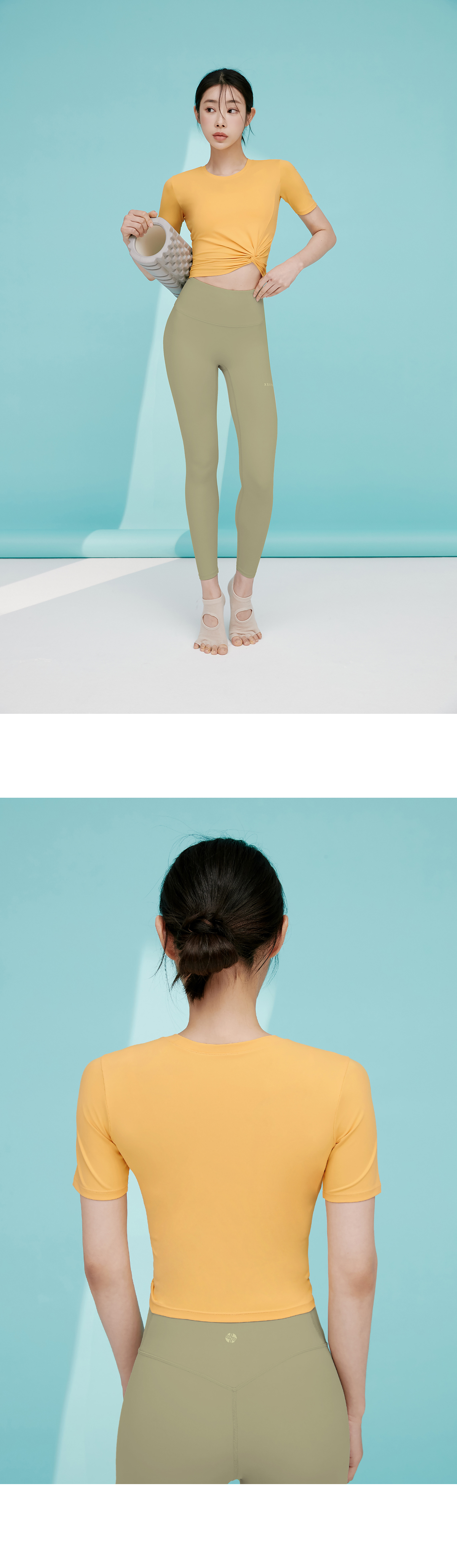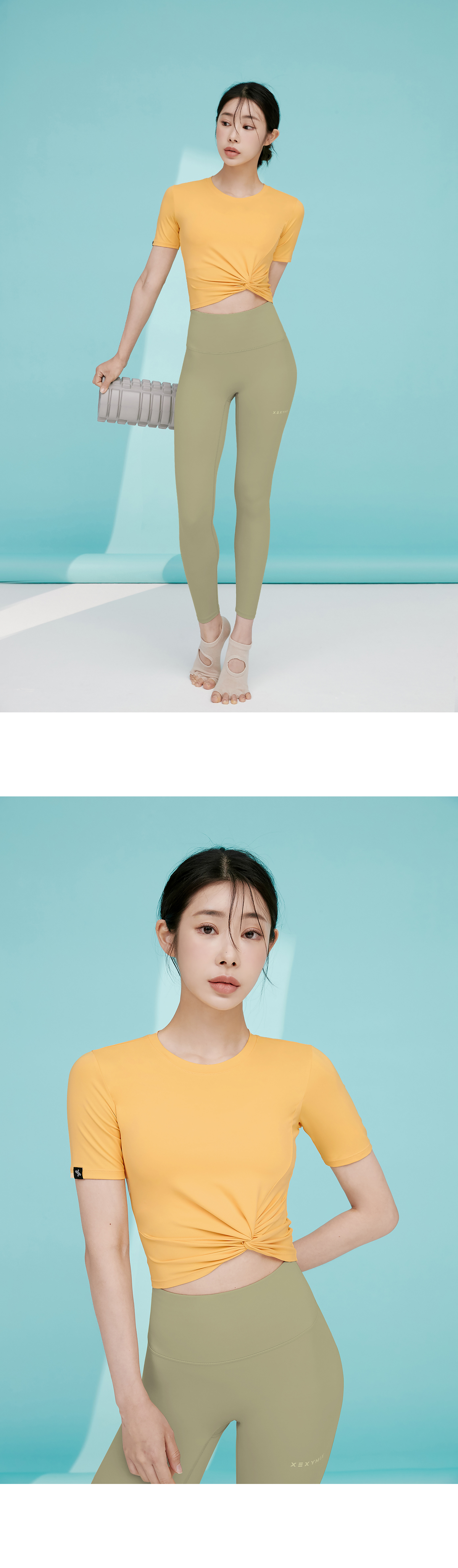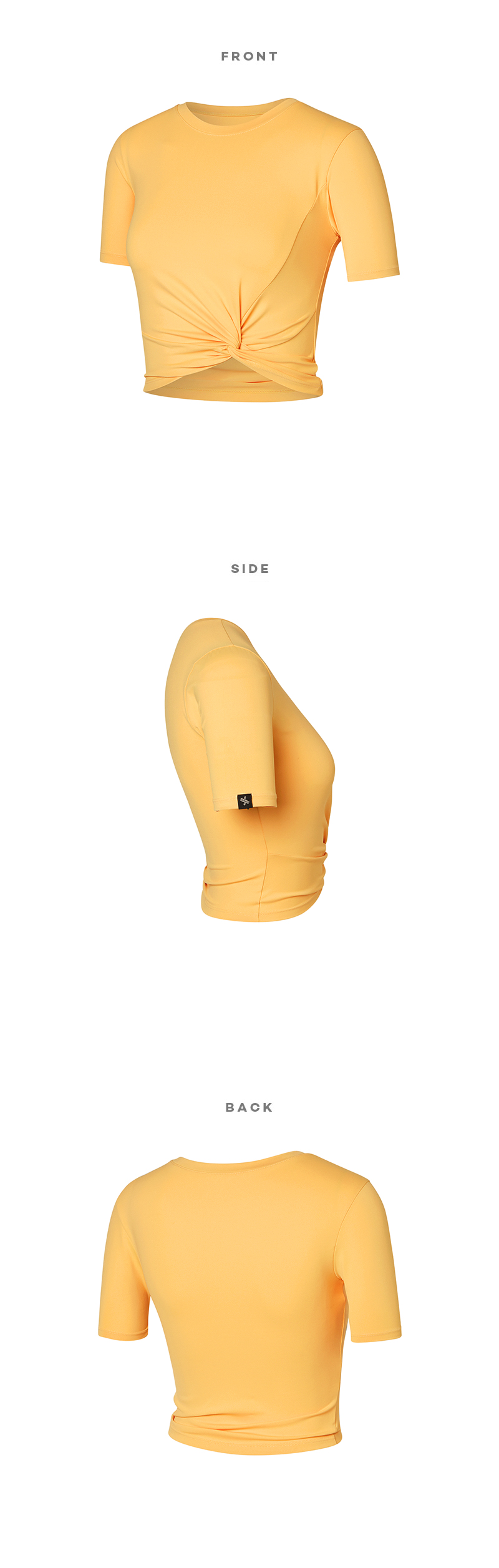 베이직한 라운드 넥 라인에 꼬임 디테일로 슬림한 허리라인이 돋보이는 크롭 숏슬리브예요.