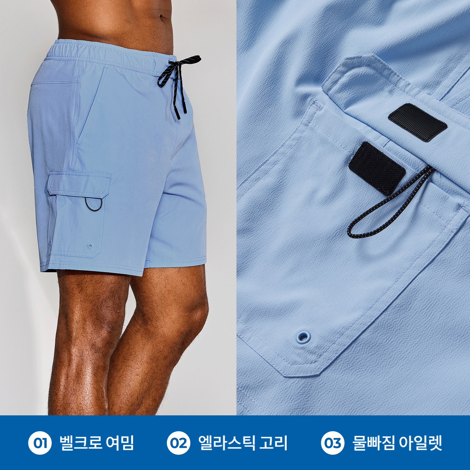 메쉬 안감 실용성을 극대화한 가벼운 소지품을 보관할 수 있는 사이드 포켓에 소프트 메쉬 안감을 사용해 터치감이 부드럽고 물 빠짐이 용이해 물놀이 시 주머니에 물이 차지 않아요.