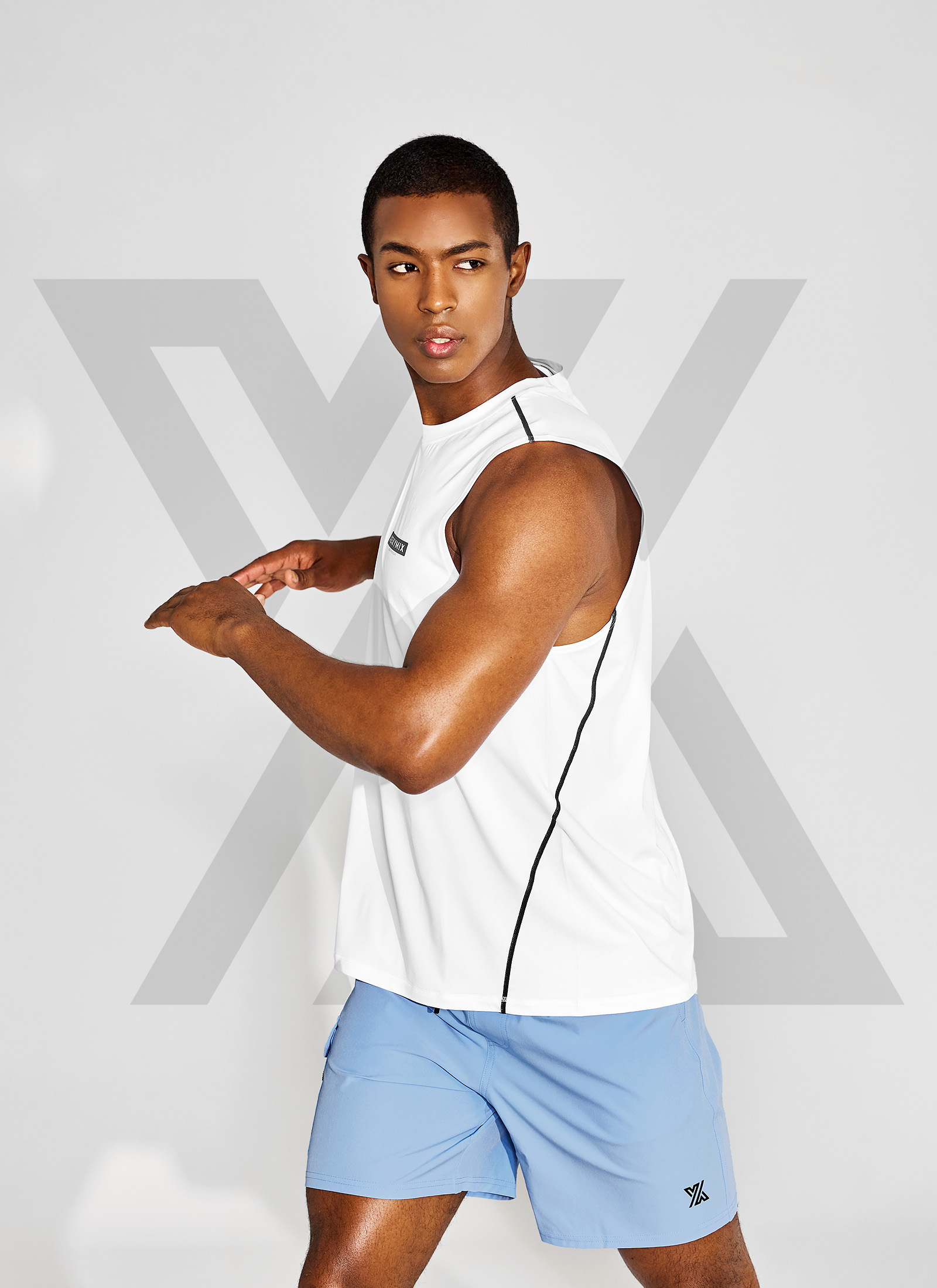 젝시믹스의 왼쪽 하단에 젝시맨즈 심볼을 넣어 브랜드 아이덴티티를 더해주는 포인트를 더했어요. TECH POINT