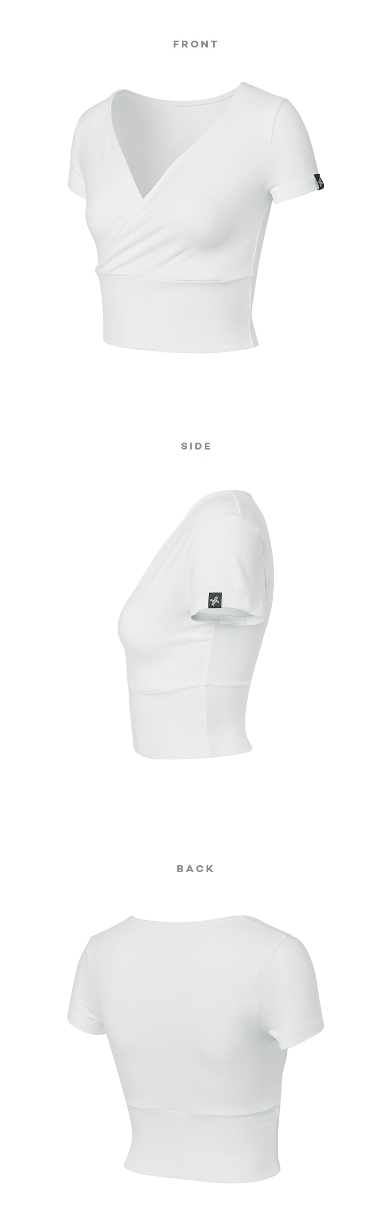 랩 스타일로 깊게 파인 넥 라인과 크롭 기장으로 페미닌한 스타일을 연출해 주는 숏슬리브 탑이에요. 유연한 탄성력을 갖춘 소재로 부드러운 감촉과 윤기 있는 표면으로 한 층 더 고급스러운 무드를 완성해 줘요. V넥 디자인이 갸름한 얼굴형과 더욱 긴 목선을 연출해 주고, 브라탑 위에 커버업으로 부담 없이 착용할 수 있어요. 바스트 밑단을 제원단으로 넓게 디자인하여 활동적인 퍼포먼스 시에도 허리를 안정적으로 잡아줘 슬림하고 탄력적인 실루엣을 보여줘요. 허리선 위로 올라오는 크롭 기장에 체형에 편안하게 밀착하는 입체 패턴으로 완벽한 슬림 아웃핏을 경험해 보세요.