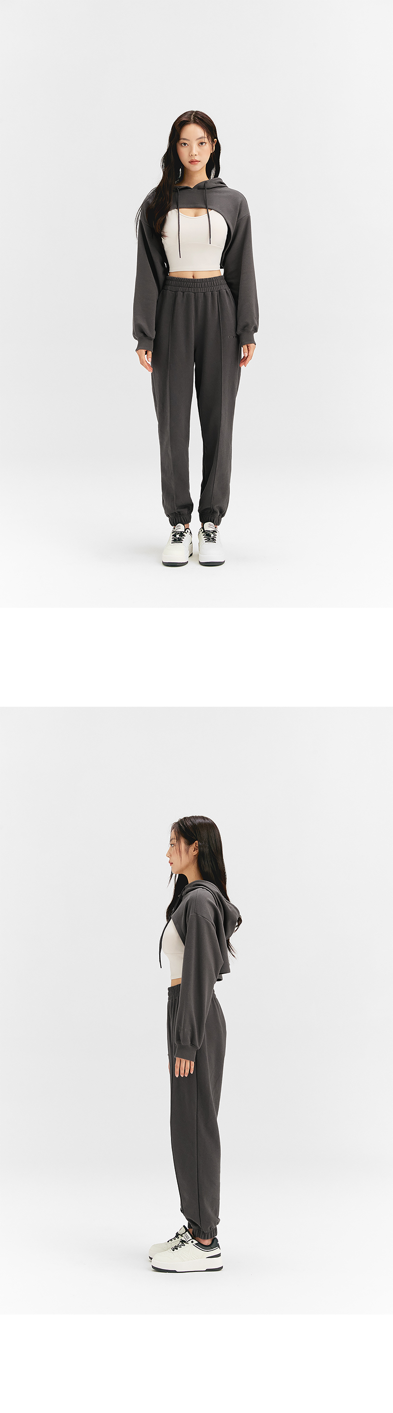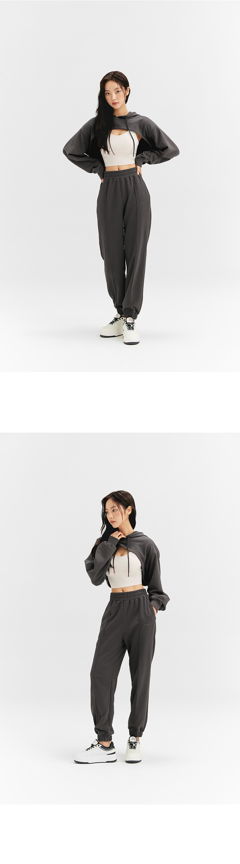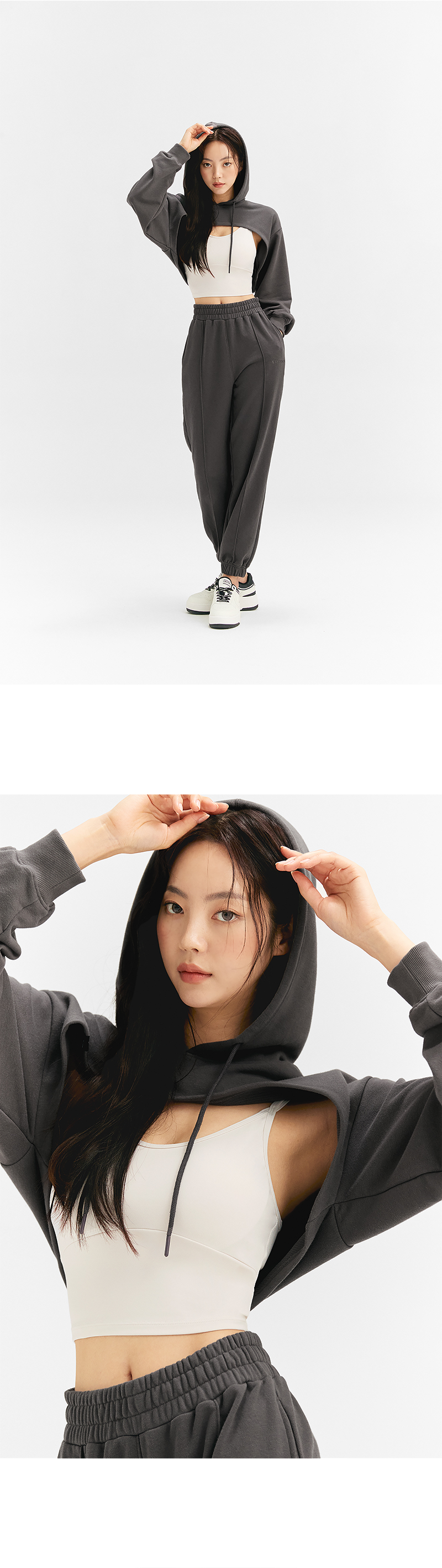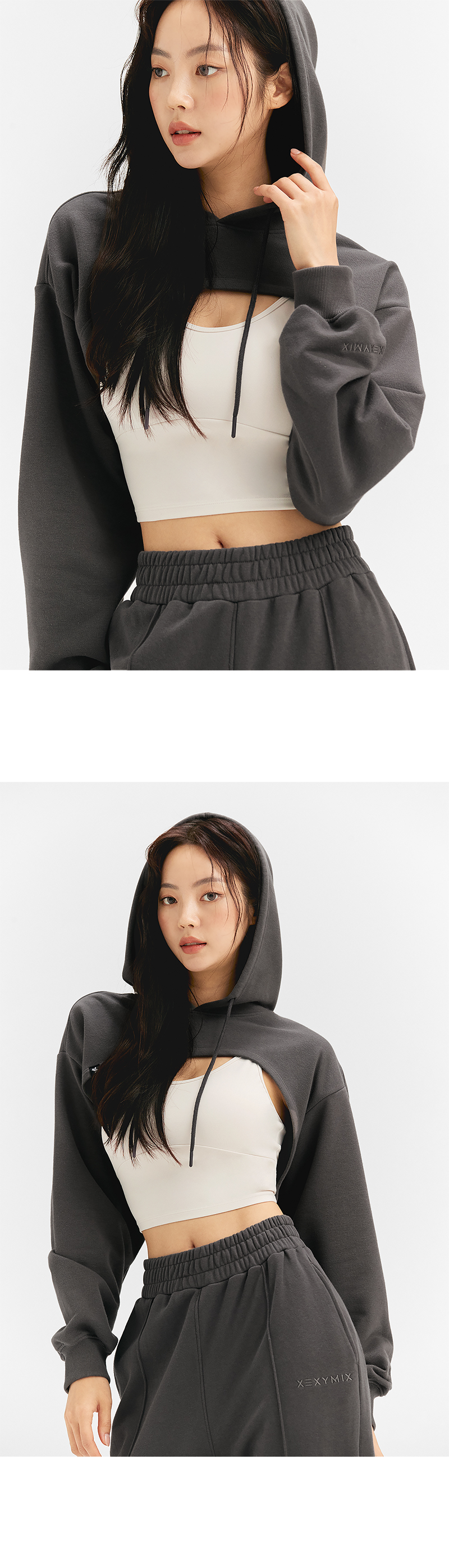 앞, 뒤 기장이 다른 유니크한 디자인의 레이어드 후드 맨투맨이에요. 바스트 라인을 더욱 돋보이게 하는 라운딩 밑단으로 브라탑, 크롭탑 위에 커버업으로 매치하기 좋아요. 면과 폴리에스터를 혼방한 두께감이 있는 소재로 간절기에 입기 좋고, 편안한 착용감을 줘요. 덤블 워싱과 텐타 가공 처리로 섬유 날림과 수축 현상을 최소화하였고, 유연하고 부드러운 터치감을 느낄 수 있어요. 넉넉한 크기의 후드와 스트링이 두상을 안정감 있게 감싸주며, 캐주얼한 분위기를 연출해 줘요. 소맷단은 탄탄하고 복원력이 강한 립원단으로 마감해 핏 변형을 방지해주고, 옷의 완성도를 높여줘요. 볼륨감 있는 벌룬핏 소매로 체형커버는 물론 스타일리시한 실루엣을 연출해 줘요. 우측 밑단 부분의 포인트 라벨과 좌측 소매의 로고 자수가 젝시믹스의 아이덴티티를 포인트 있게 보여줘요. 유니크 하면서 트렌디한 디자인이지만 베이직한 컬러 웨이로 구성되어 부담없이 입을 수 있어요. 같은 컬러감의 핀턱 조거팬츠, 아웃포켓 조거팬츠와 매치하면 셋업 무드로 연출할 수 있어요.