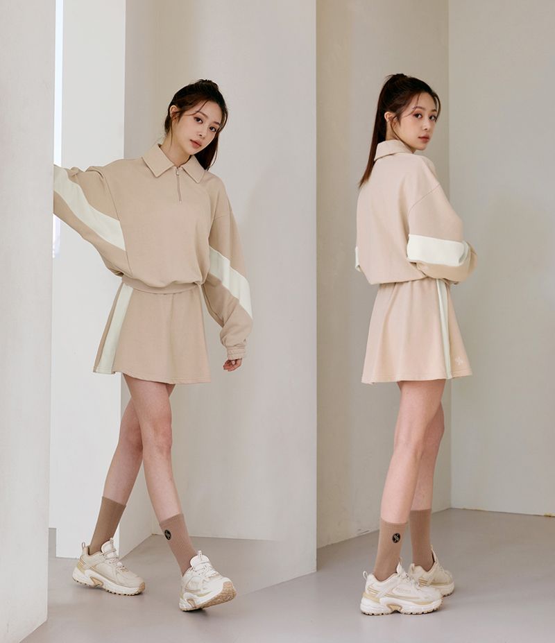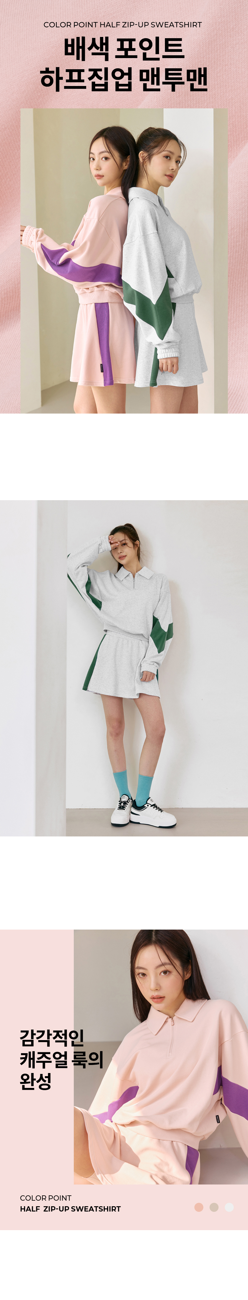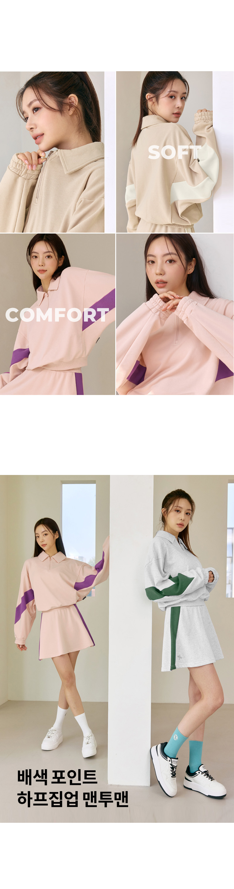 감각적인 캐주얼 룩을 완성해주는 배색 포인트 하프집업 맨투맨이에요. 면과 폴리에스터를 혼방한 두께감 있는 소재로 부드러운 터치감과 편안한 착용감이 좋아요. 덤블 워싱과 텐타 가공 처리로 섬유 날림과 수축 현상을 최소화하였고, 유연하고 소프트한 터치감을 느낄 수 있어요. 카라넥에 하프 집업이 결합된 디자인으로 입고 벗기 편리하도록 실용성을 높였고, 오픈 & 클로징으로 투웨이 연출이 가능해요. 돌먼 소매 디자인으로 둥글고 귀여운 핏이 연출되고, 소매의 컬러 배색이 스포티한 무드를 보여줘요. 어깨선을 여유 있게 디자인한 드롭 숄더 스타일로 군살을 가려주어 체형 보완 효과를 줘요. 소맷단에 밴드를 삽입해 흘러내리지 않도록 잡아주고, 두줄 스티치를 넣어 디자인 포인트를 더했어요. 밑단은 탄탄하고 복원력이 강한 립원단으로 마감해 옷의 안정적인 형태를 유지해줘요. 뒷목 중심 심볼 로고 자수와 좌측 사이드 부분의 포인트 라벨이 젝시믹스의 아이덴티티를 심플하게 보여줘요. 배색 포인트 플레어 스커트와 세트로 매치해 애슬레저 룩, 데일리 웨어로 연출해 보세요.