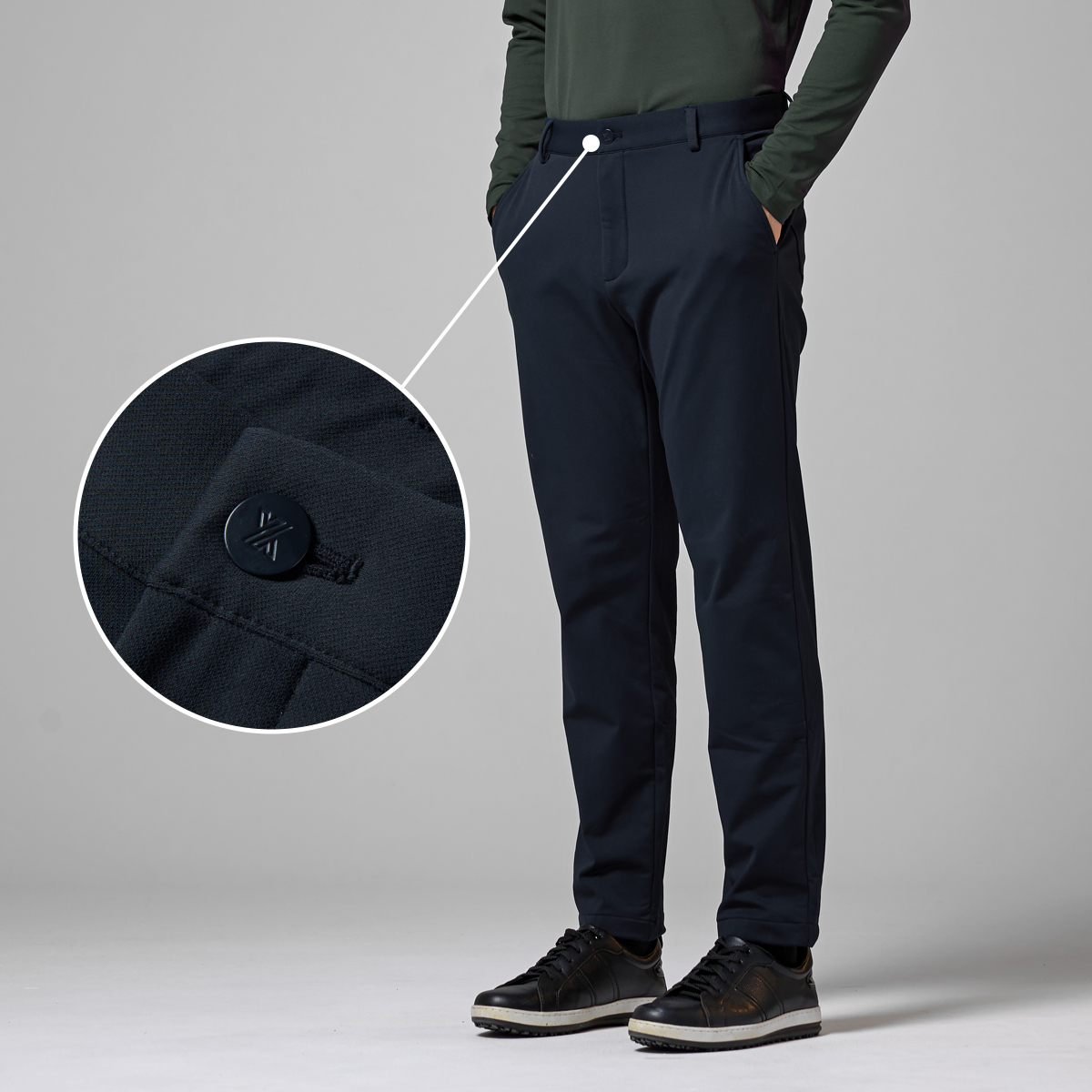 깔끔한 허릿단 허릿단의 지퍼 & 버튼 클로징이 포멀한 무드를 더해주며, 젝시믹스 심볼로고가 새겨진 버튼으로 포인트를 줬어요.