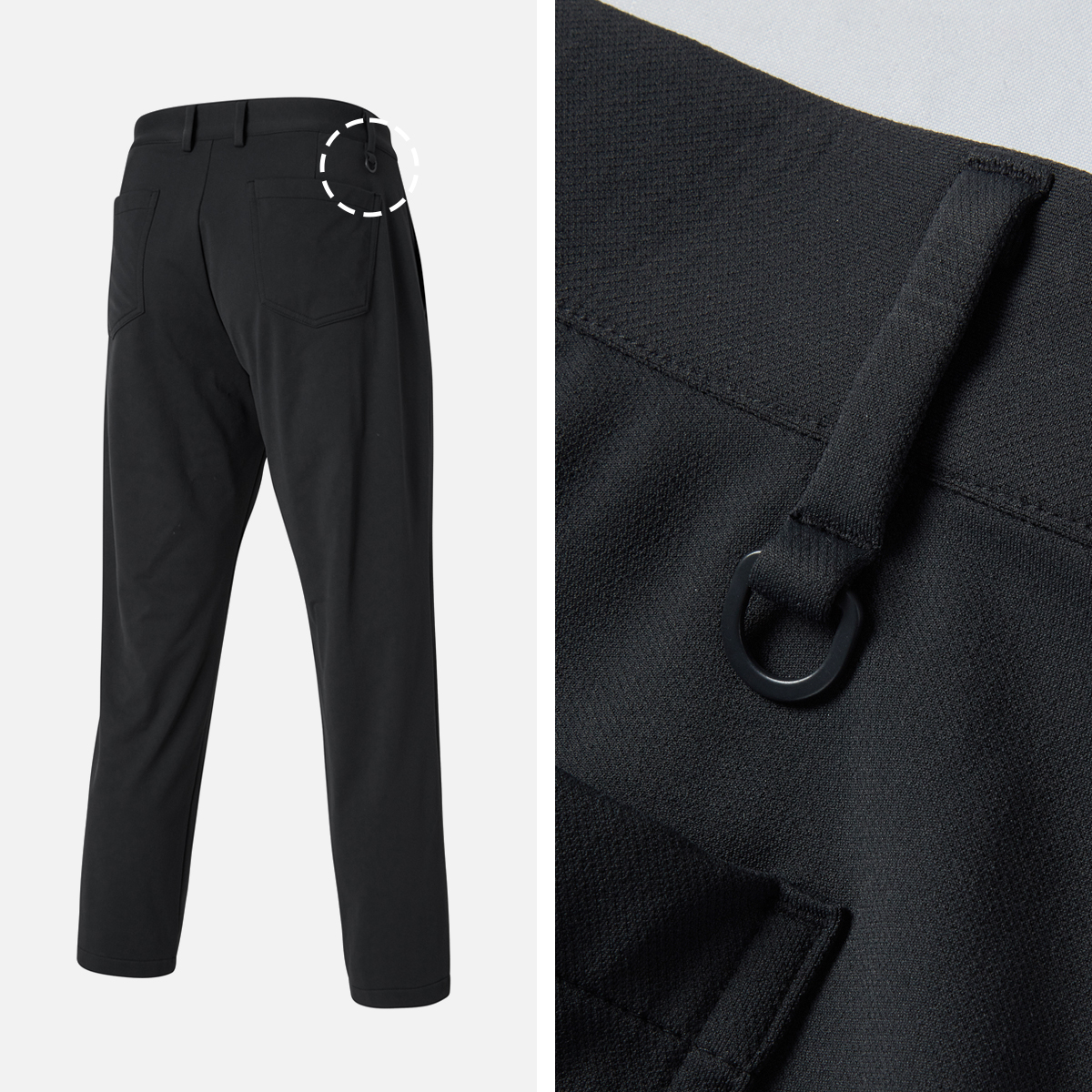 실용성을 높여주는 벨트 고리가 있어 허리 사이즈에 맞게 안정감 있게 착용할 수 있고, 뒷면 우측에 D링을 더해 거리 측정기나 간단한 소지품을 걸어 사용할 수 있어요.