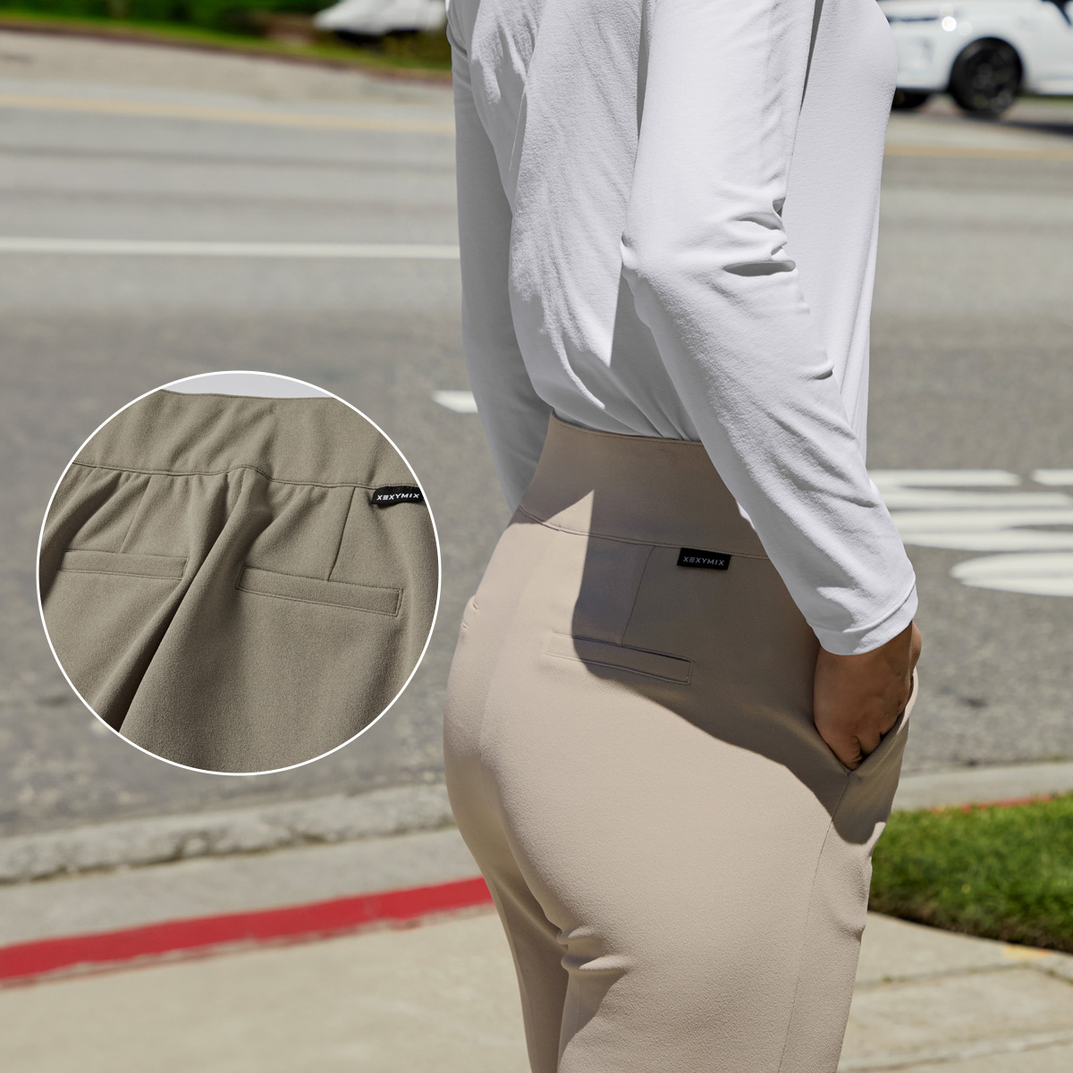 05 "뒷모습까지도 흐트러짐 없죠." 뒷면 허리 아래에 다트를 잡아 입체적인 힙 라인을 연출해 주며, 힙 위쪽에 페이크 포켓을 더해 시각적 힙 업 효과를 주는 동시에 슬랙스 특유의 클래식하고 깔끔한 아웃핏을 완성했어요.