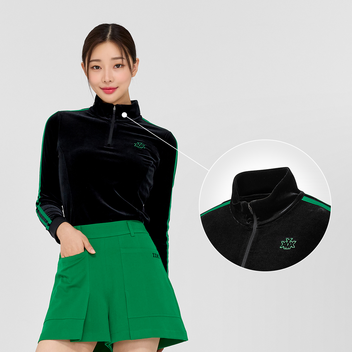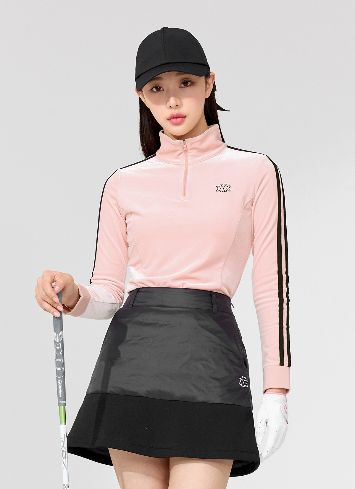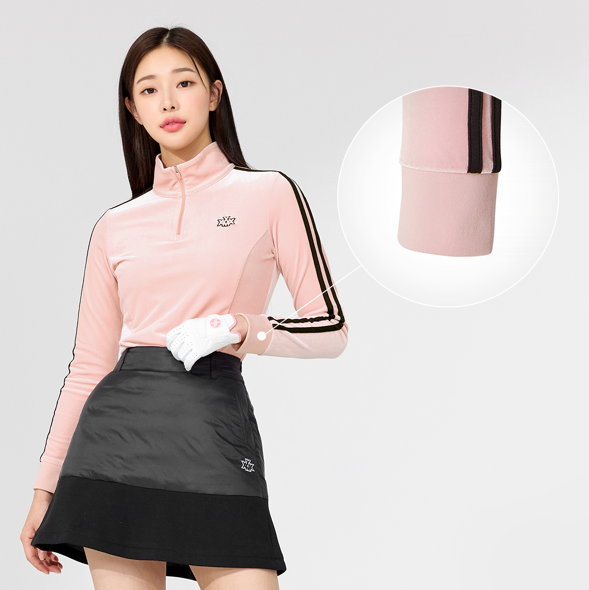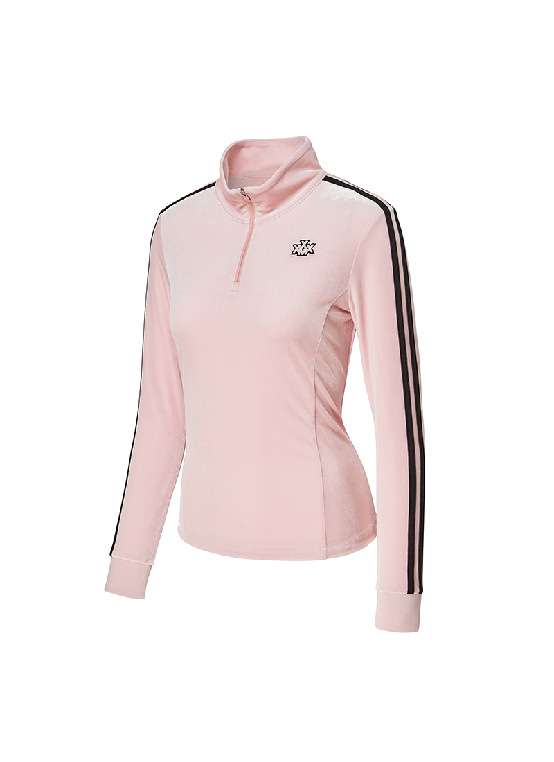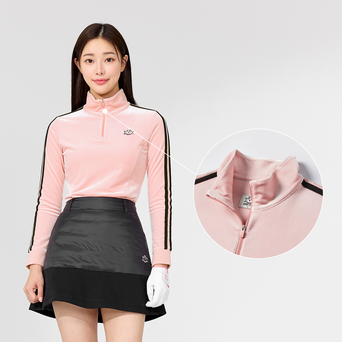 필드에서뿐만 아니라 일상에서도 하프집업 벨벳 롱슬리브 실키한 벨벳 소재로 유니크한 필드 룩 완성! 더블 라인으로 스포티 무드를 더한 하프 집업 피치
