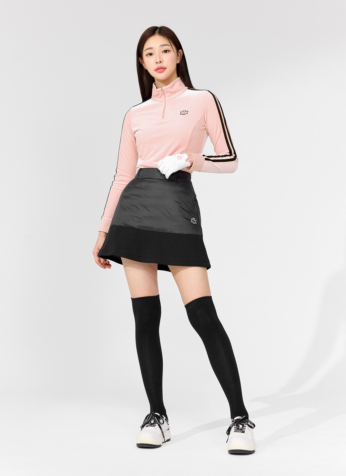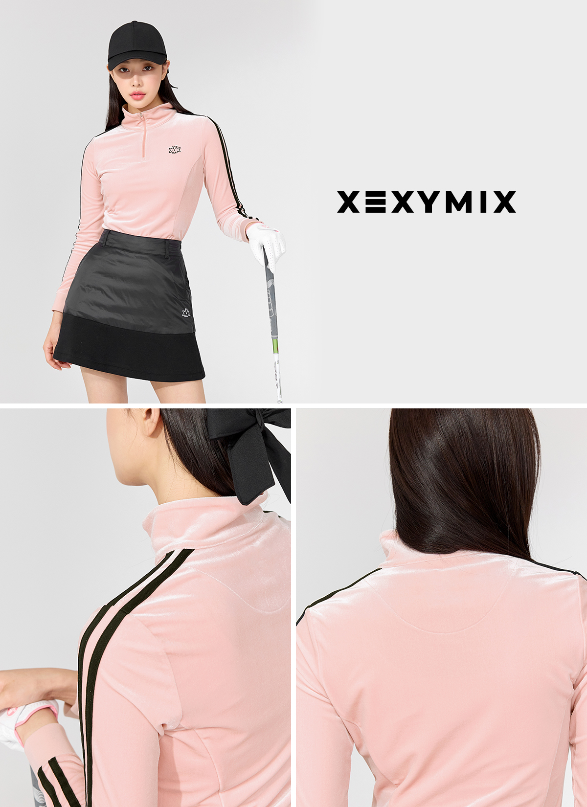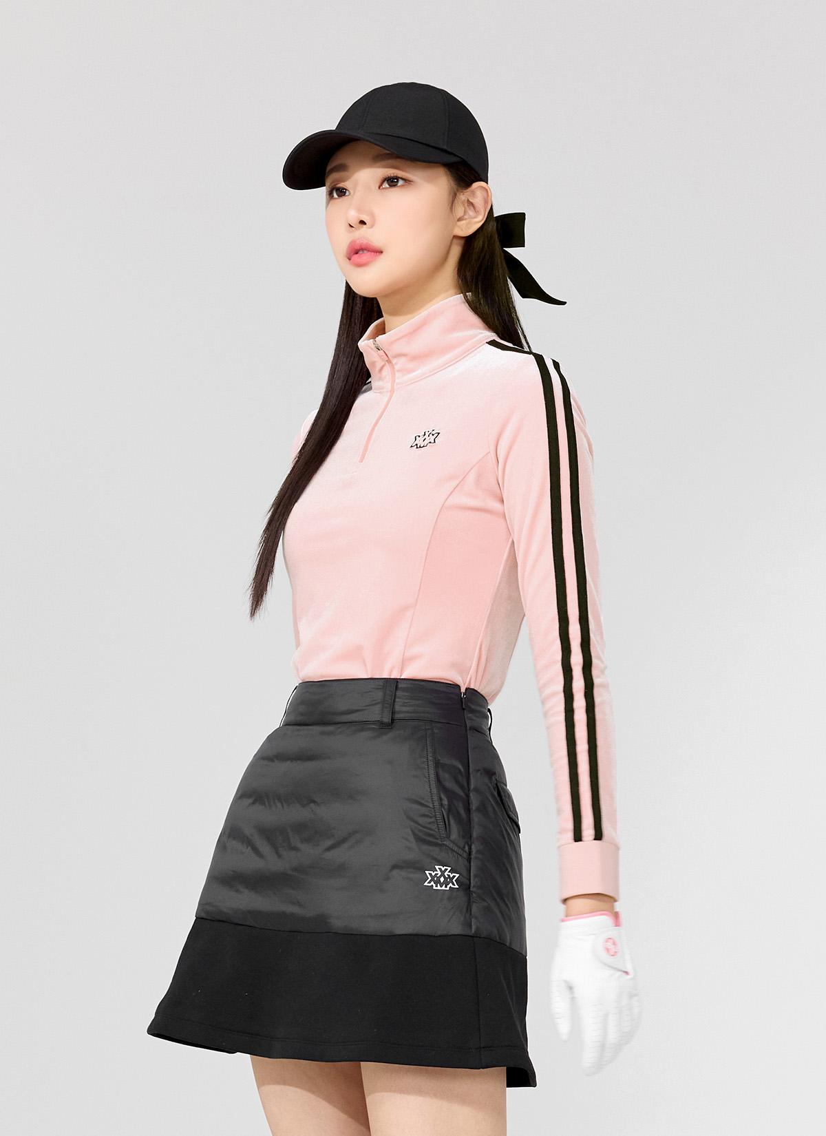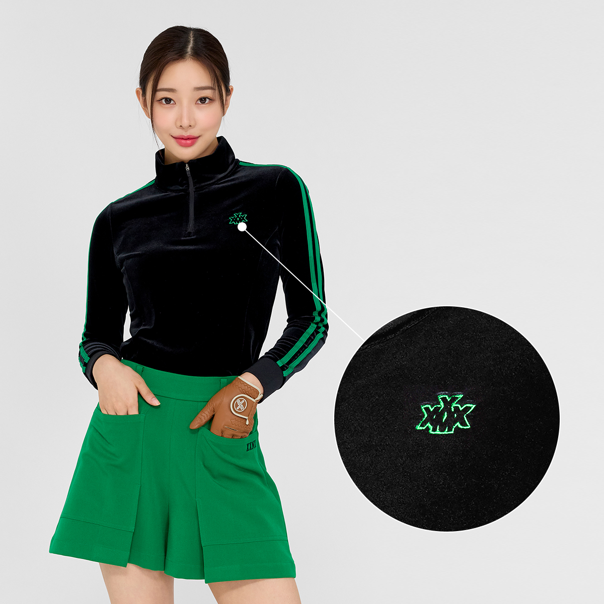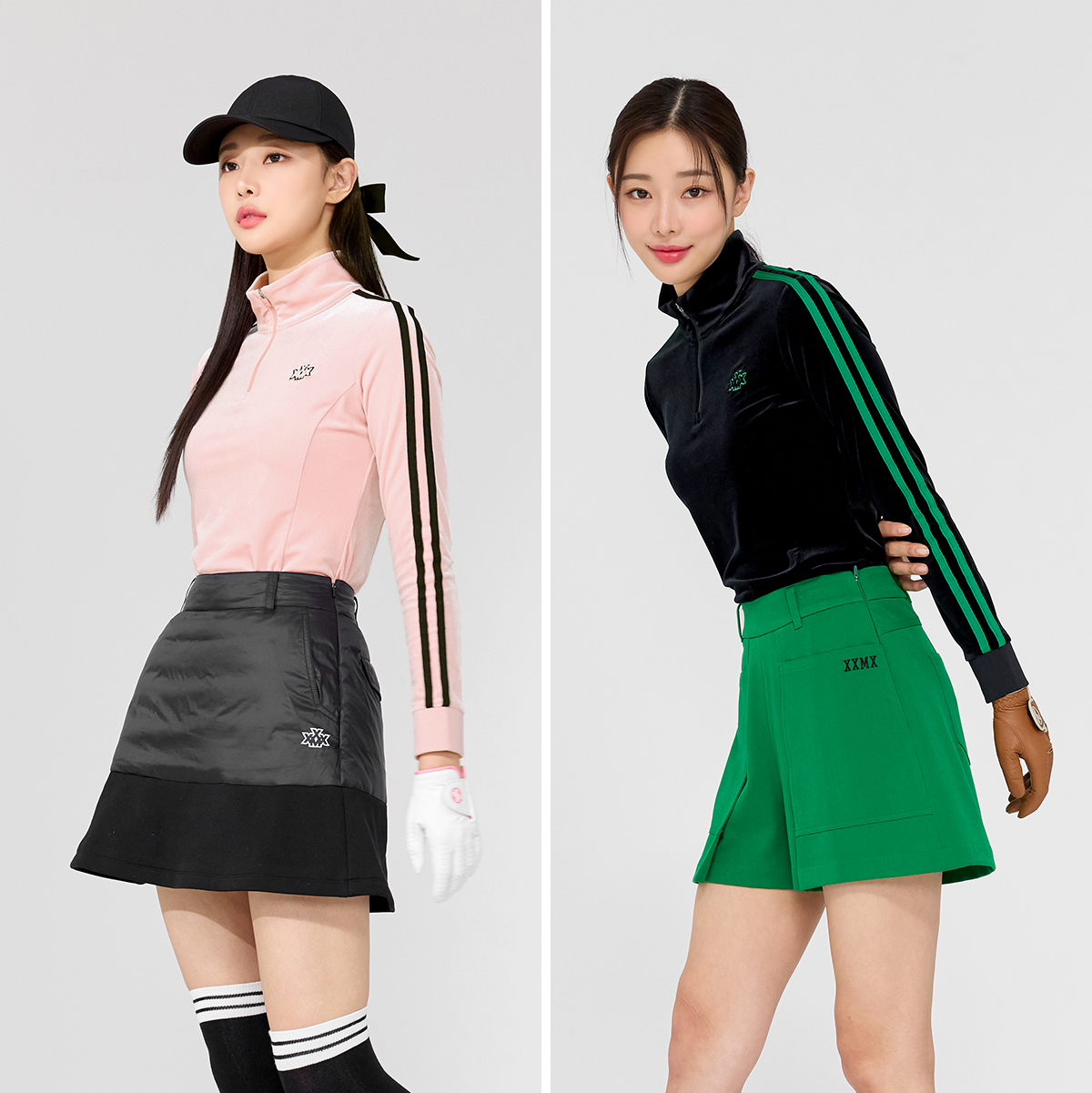 필드에서뿐만 아니라 일상에서도 하프집업 벨벳 롱슬리브 실키한 벨벳 소재로 유니크한 필드 룩 완성! 더블 라인으로 스포티 무드를 더한 하프 집업 피치