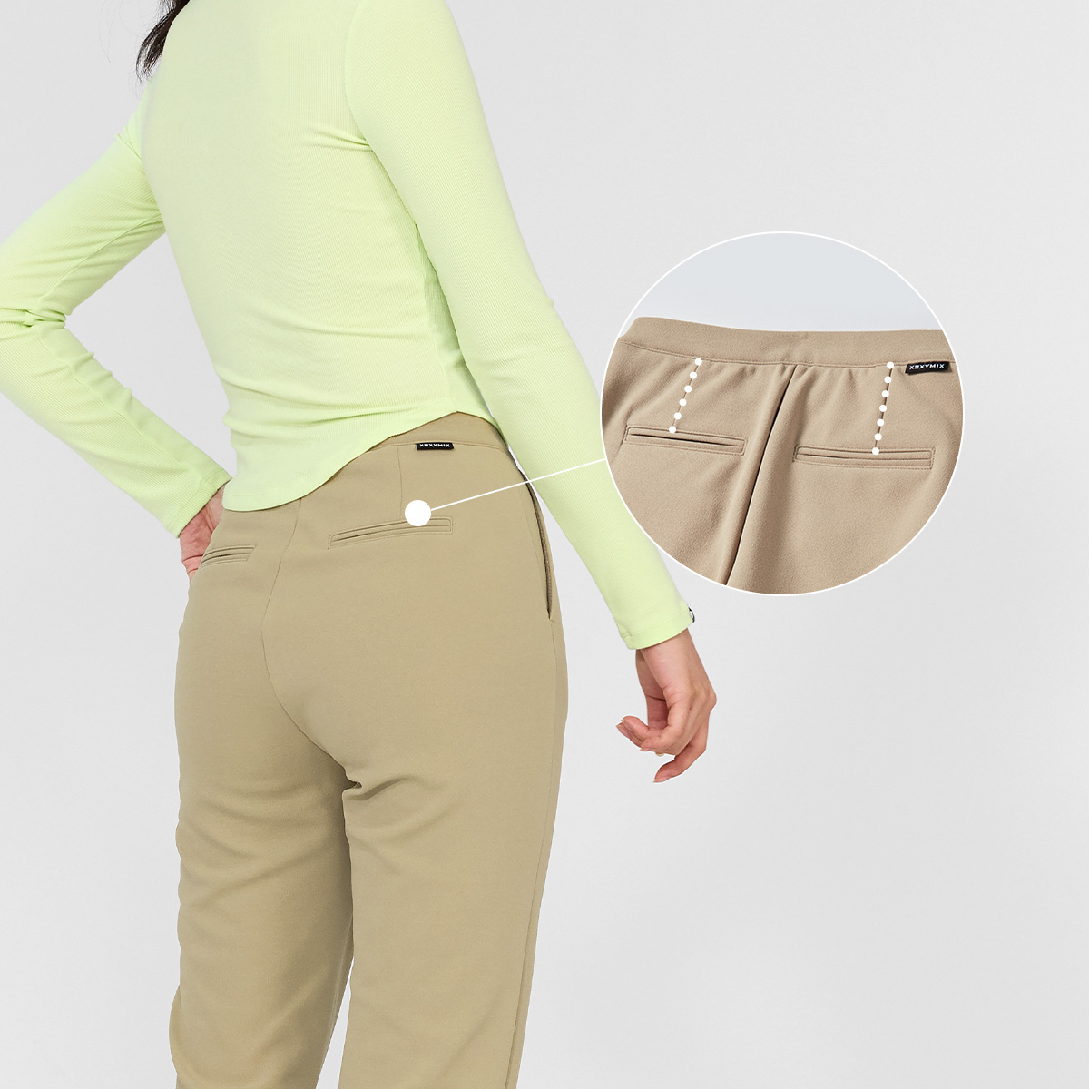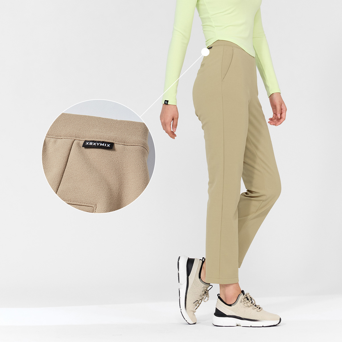 우측 허릿단에 젝시믹스 레터링 포인트 라벨을 FABRIC INFO