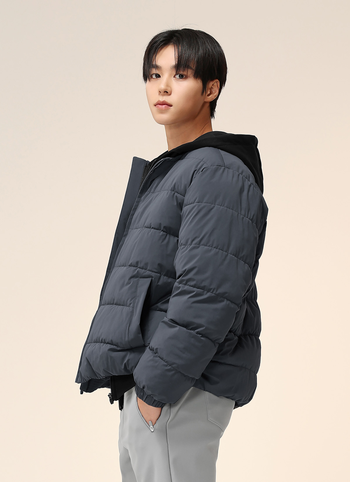 마이크로 볼 충전재로 가볍지만 포근한 경량 패딩, 베이직한 라운드 넥으로 다크그레이