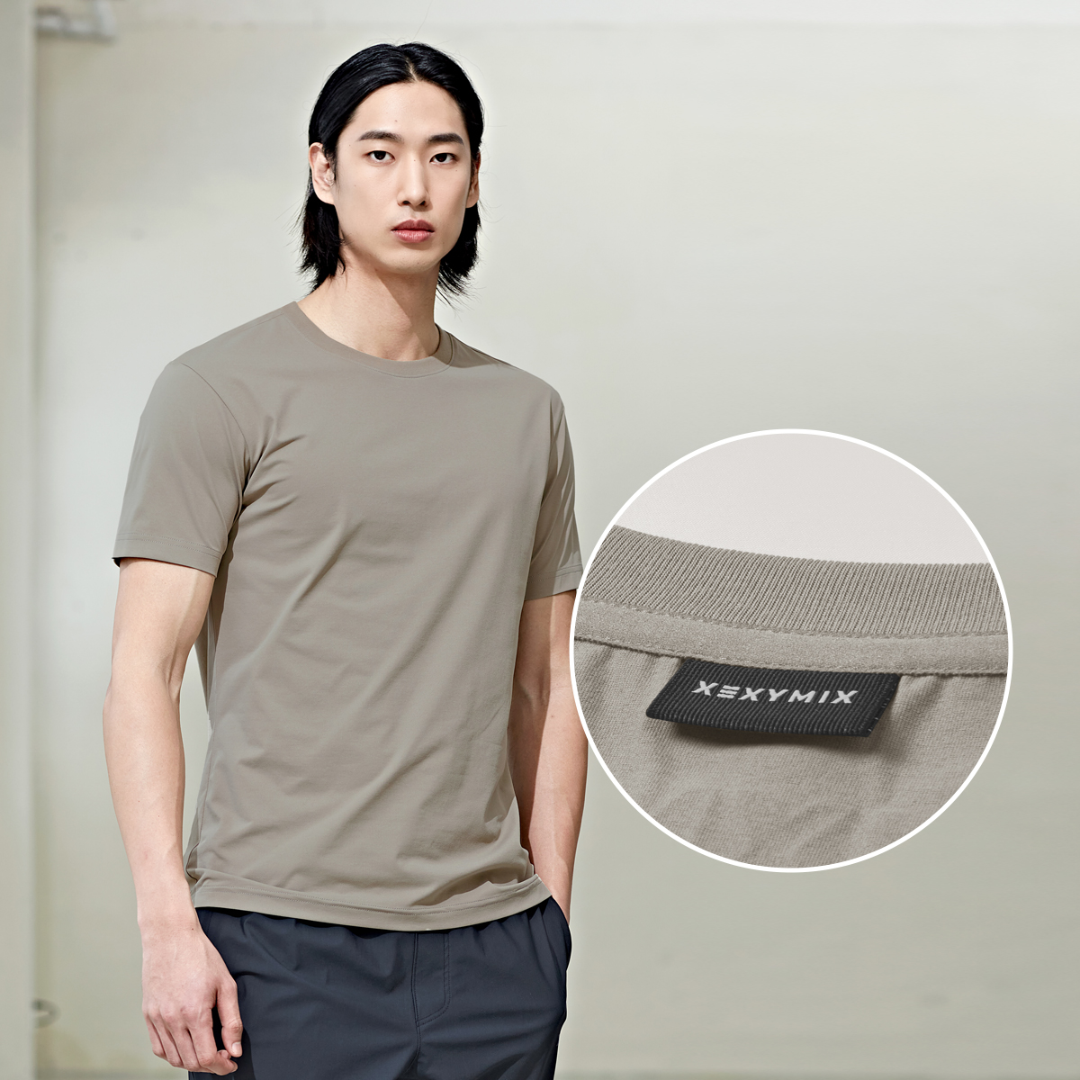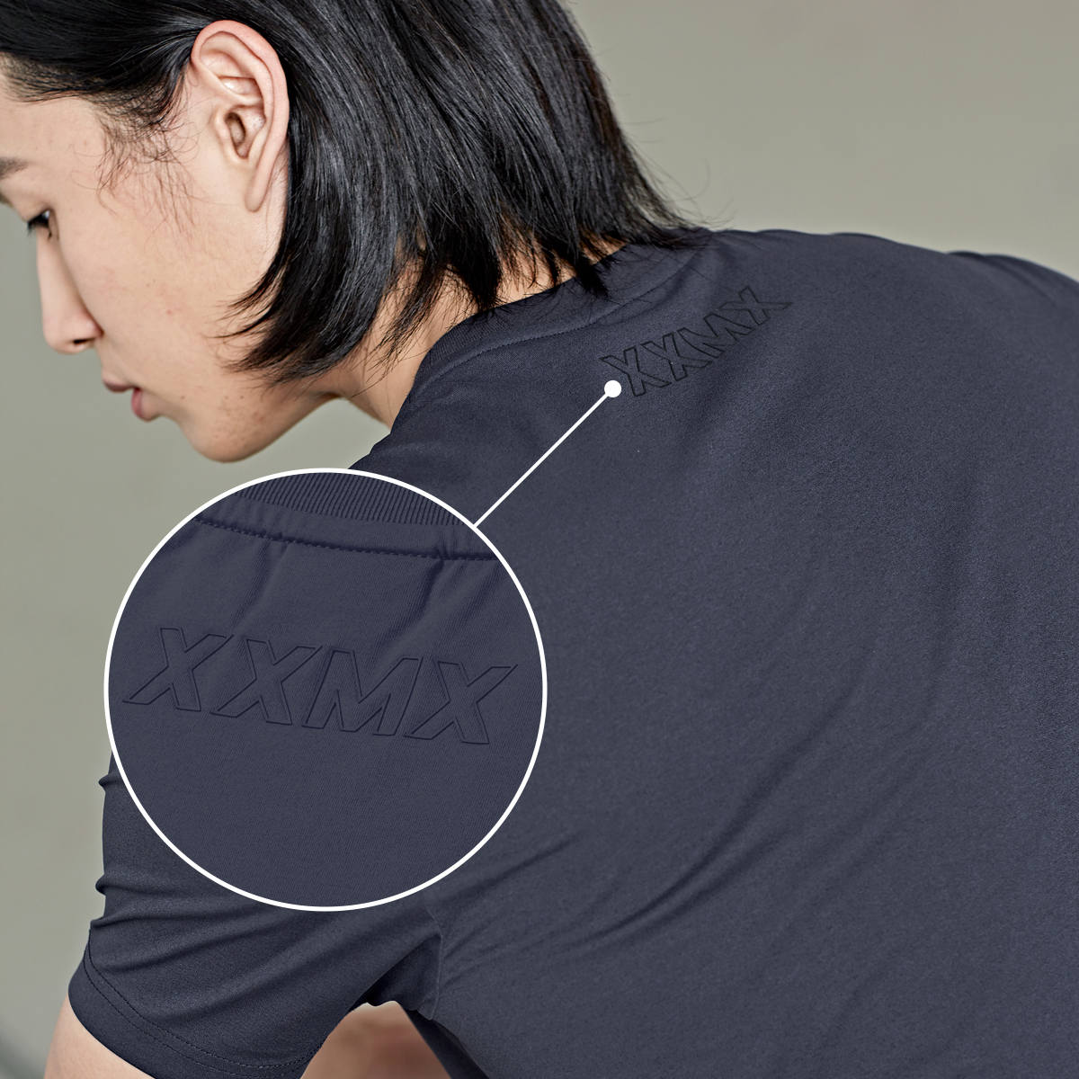 뒷목 중앙에 컬러 매칭한 XXMX 아웃라인 로고를 넣어 FABRIC INFO