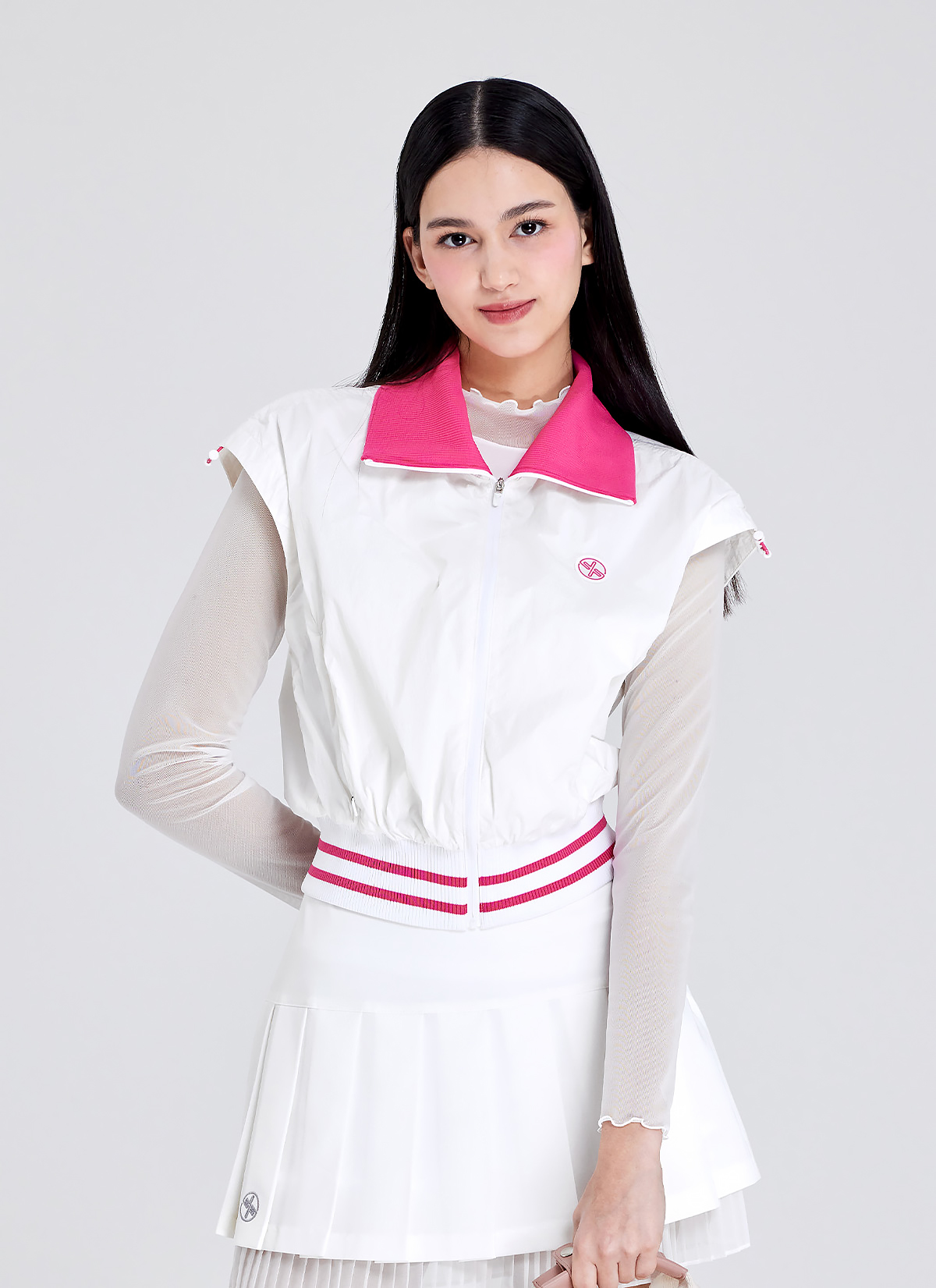 TWO-WAY 스타일링이 프런트 지퍼를 넥 라인까지 내려 배색 포인트의 칼라 넥으로, 끝까지 올려 바람을 막아주는 하이 넥으로 연출할 수 있어요.