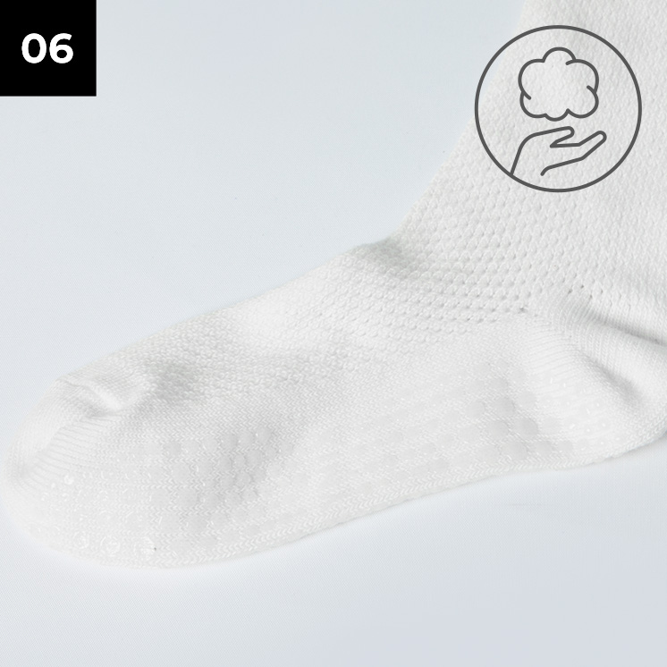 부드러운 터치감으로 발바닥은 편안하게! 발바닥 면은 면 베이스의 플레인 조직으로 편직하여 발을 편안하게 감싸줘요.