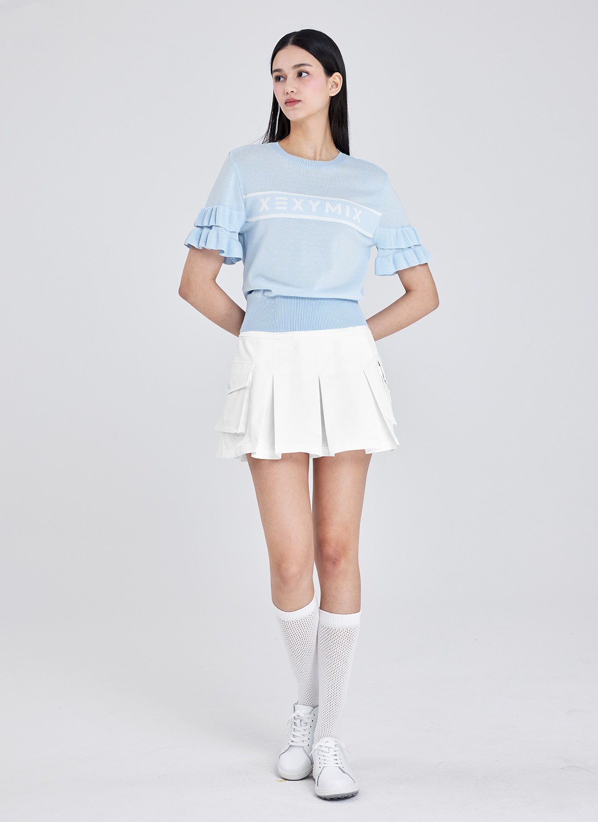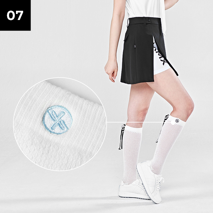 젝시믹스 아이덴티티를 종아리 상단에 젝시믹스 원형 심볼 자수를 넣어 고급스러운 포인트를 더했어요.