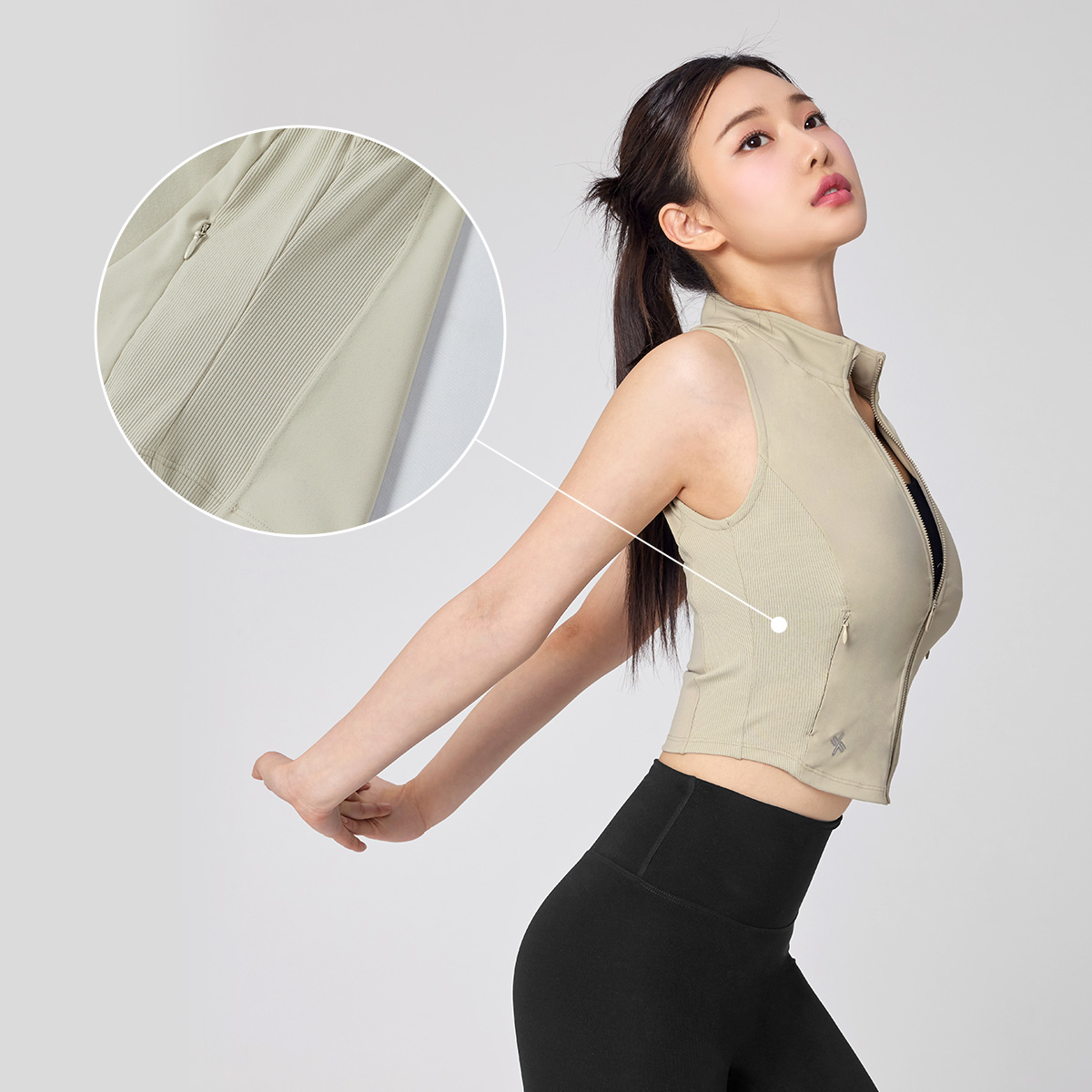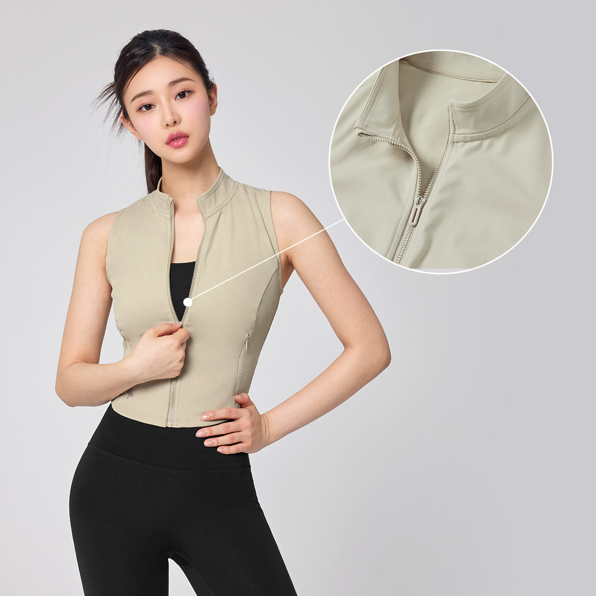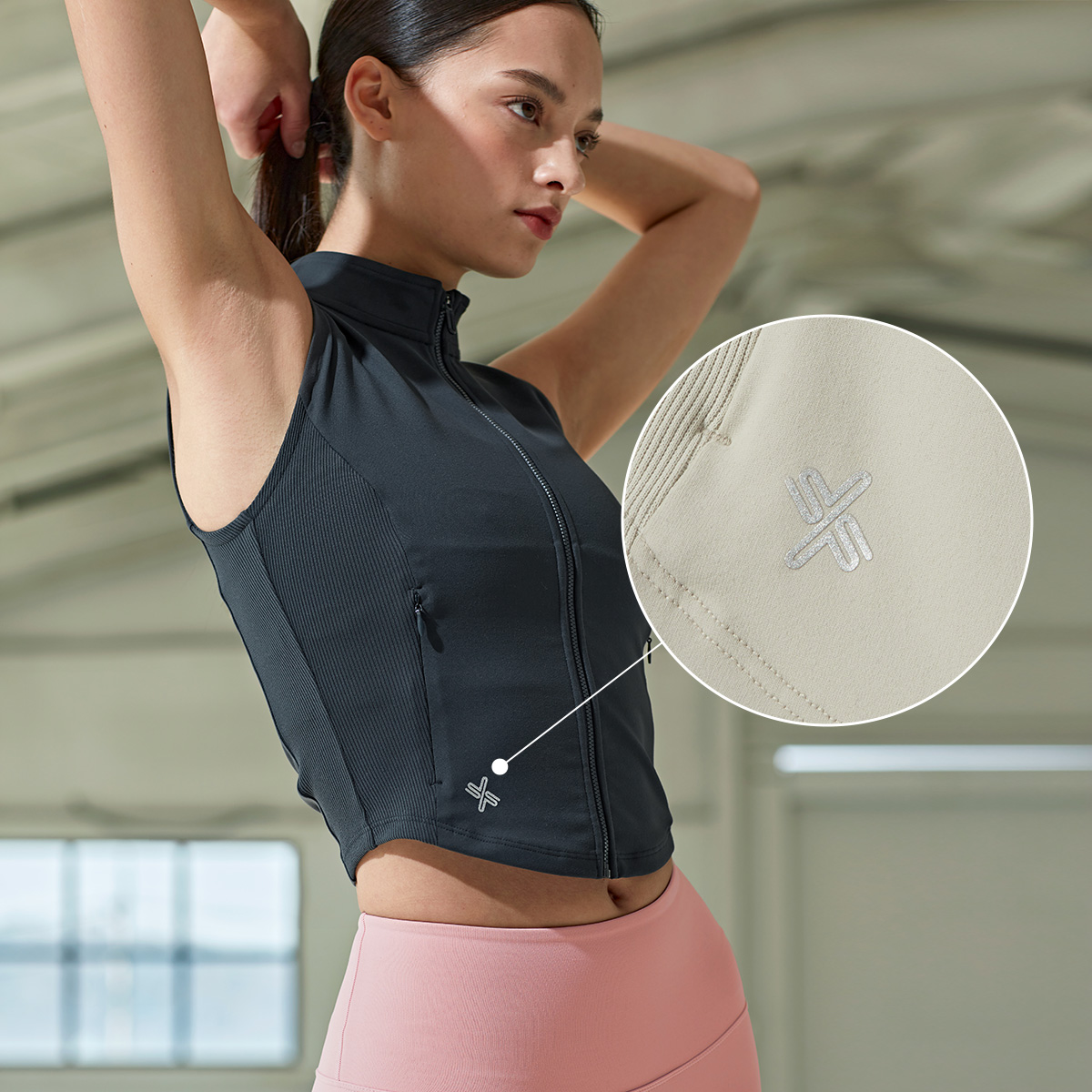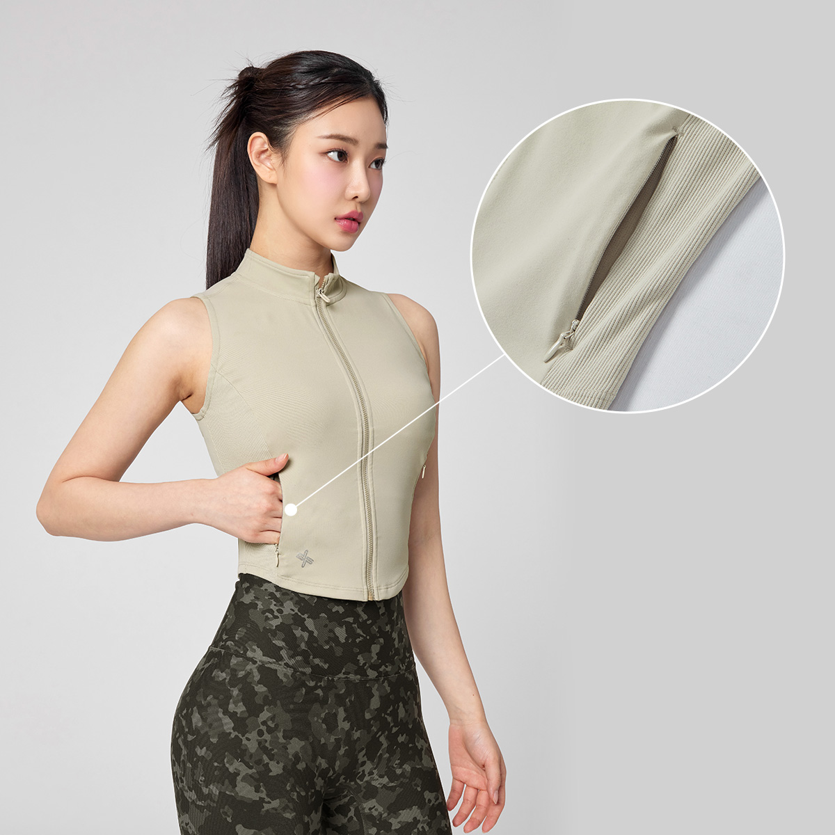 다양한 연출로 활용도 만점! 입고 벗기 간편한 풀 집업 스타일의 베스트로, 브라 탑 위에 가볍게 걸쳐 레이어링하기 좋아요.