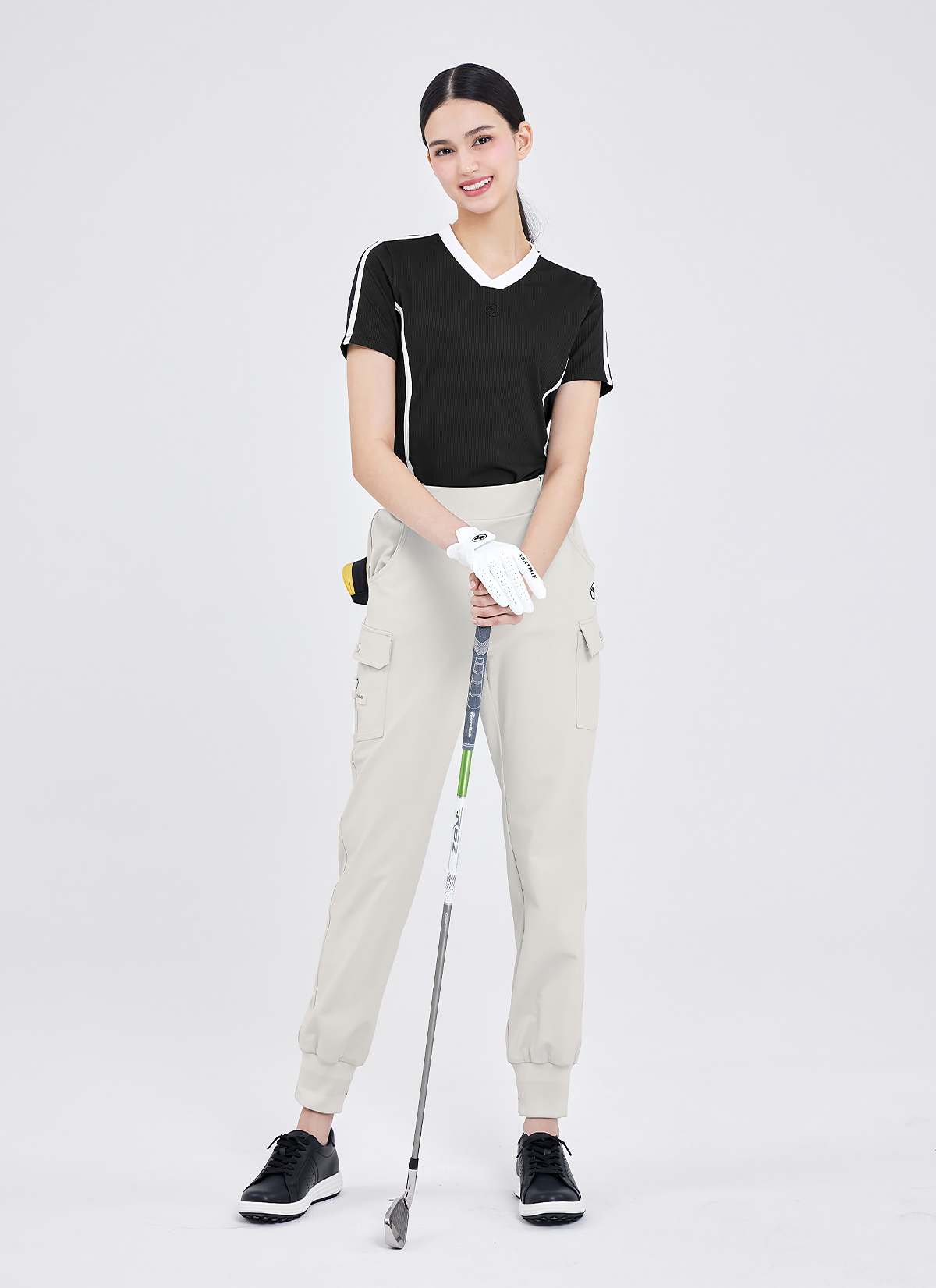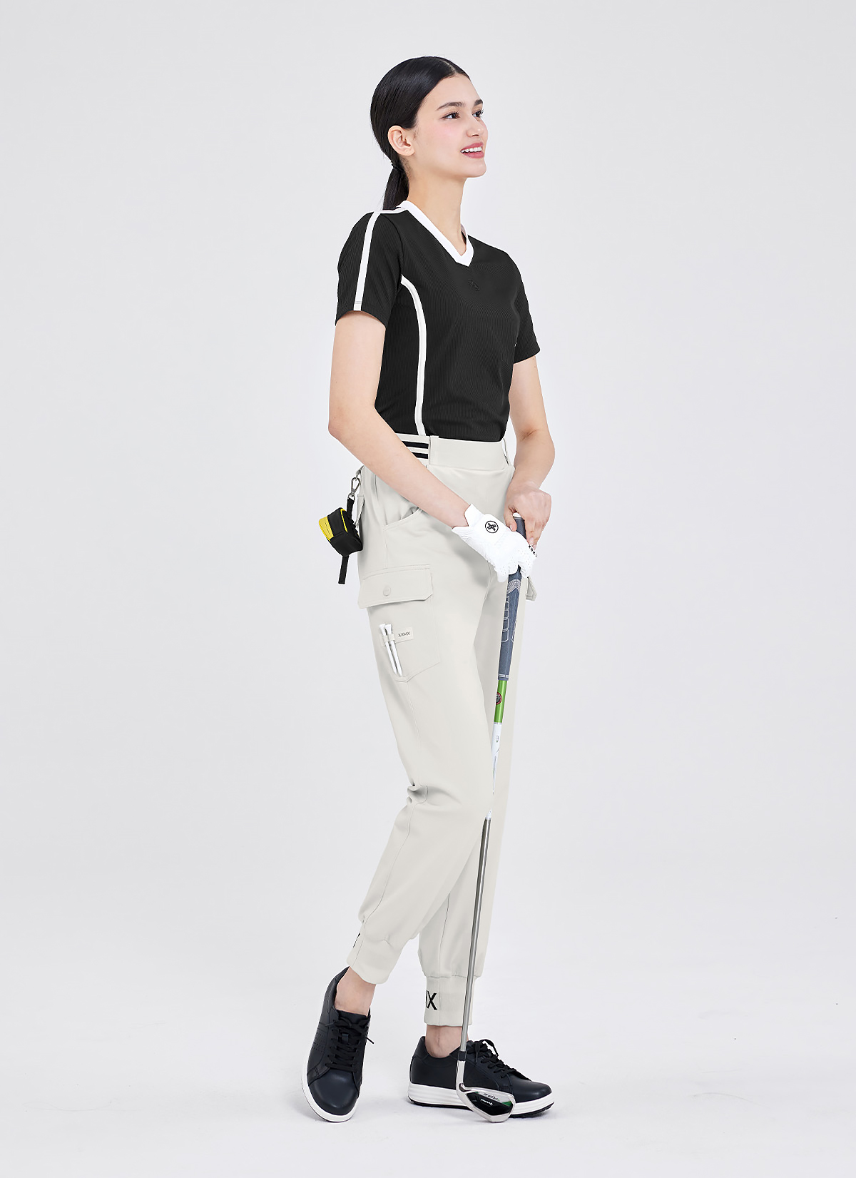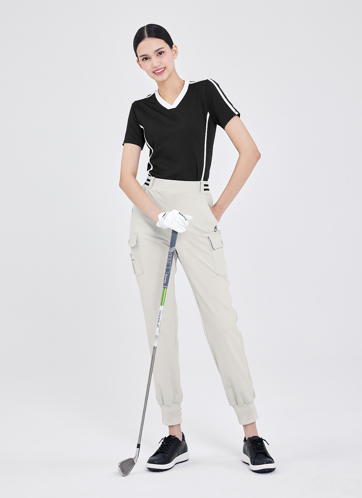 "라운딩 시 필요한 사이드 포켓과 허벅지 카고 포켓으로 실용성을 높이고, 티꽂이 로고 와펜을 더해 라운딩 시 티를 보관할 수 있어 간편해요.