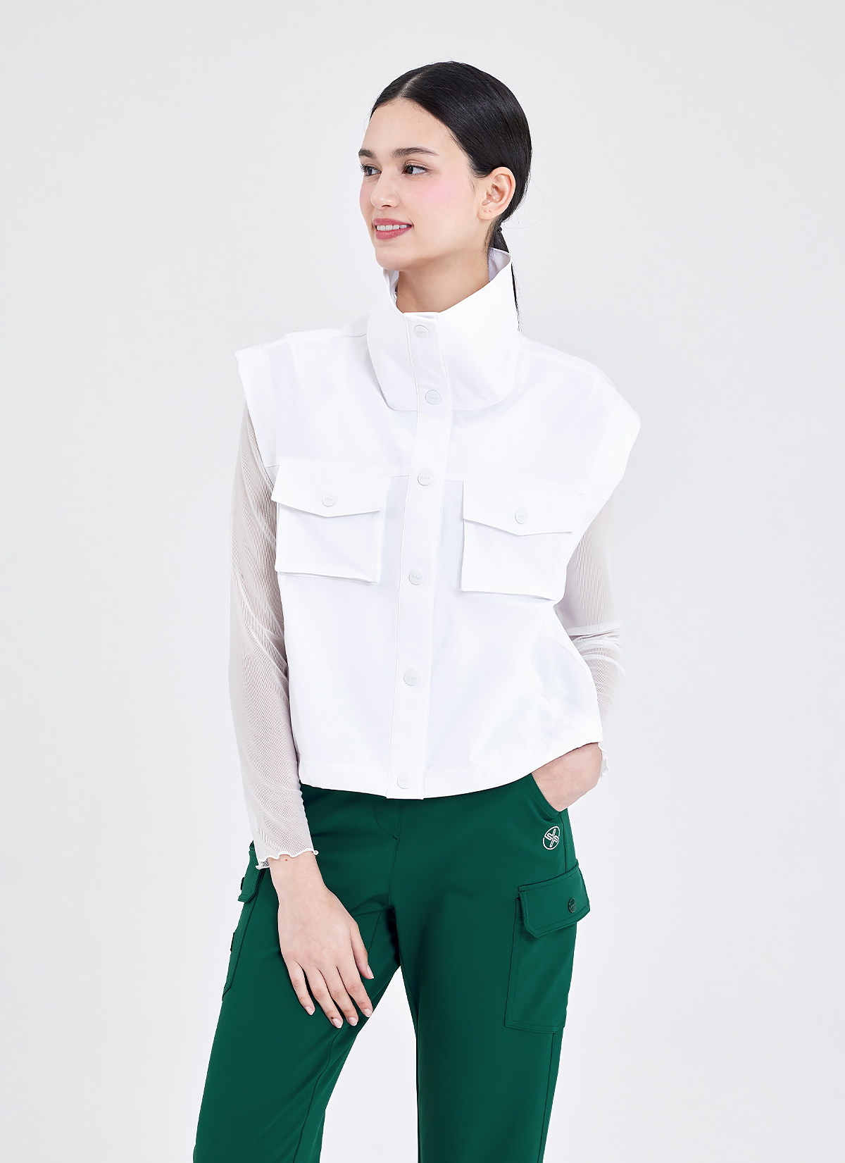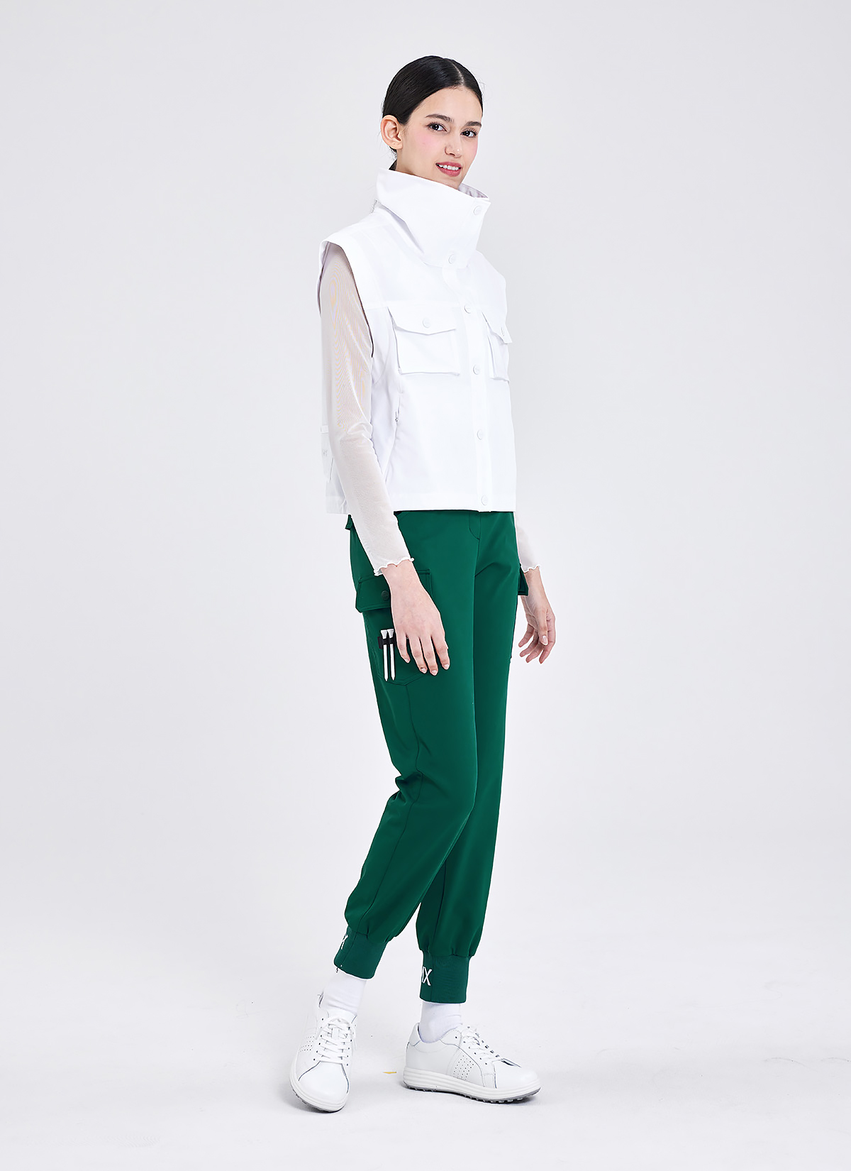 "라운딩 시 필요한 사이드 포켓과 허벅지 카고 포켓으로 실용성을 높이고, 티꽂이 로고 와펜을 더해 라운딩 시 티를 보관할 수 있어 간편해요.
