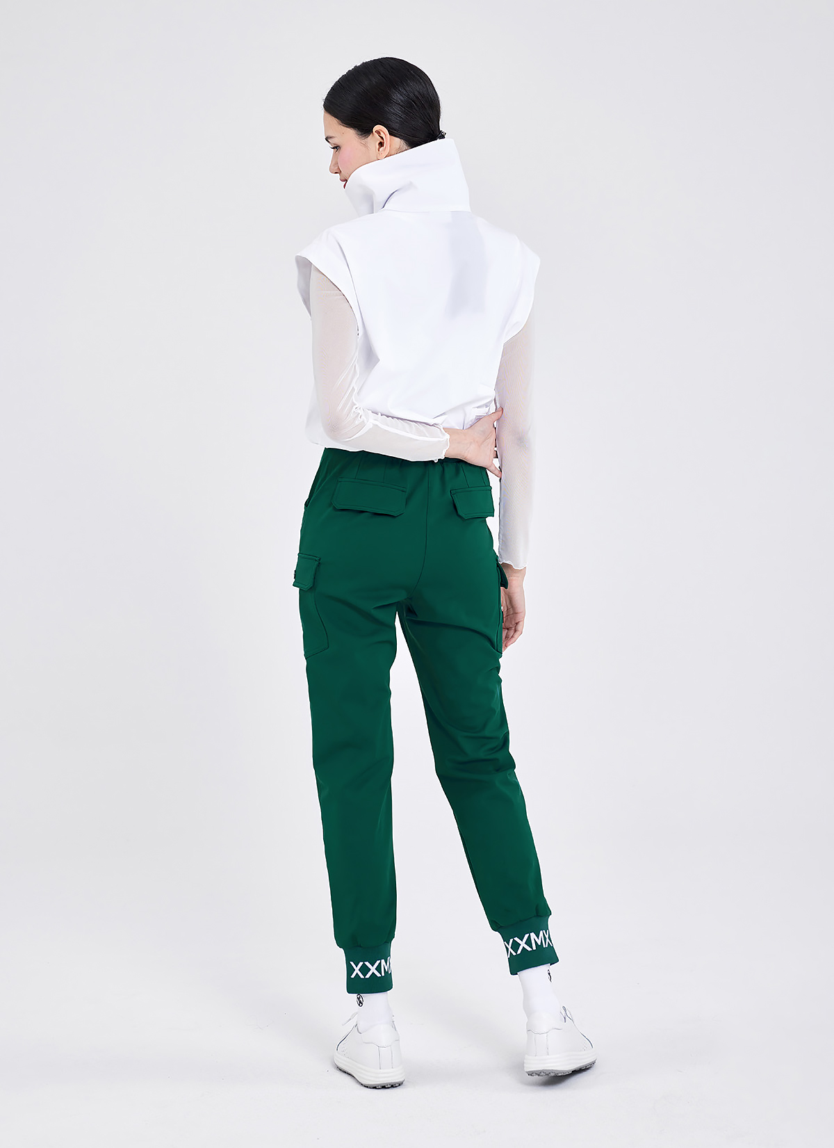 완벽한 조거 핏을 완성해 주는 유니크한 밑단 밴딩 밑단 립 밴드가 발목을 잡아주어 안정감 있는 조거 핏을 연출해 주며, 뒤쪽에는 XXMX 자카드 레터링으로 포인트를 줬어요.