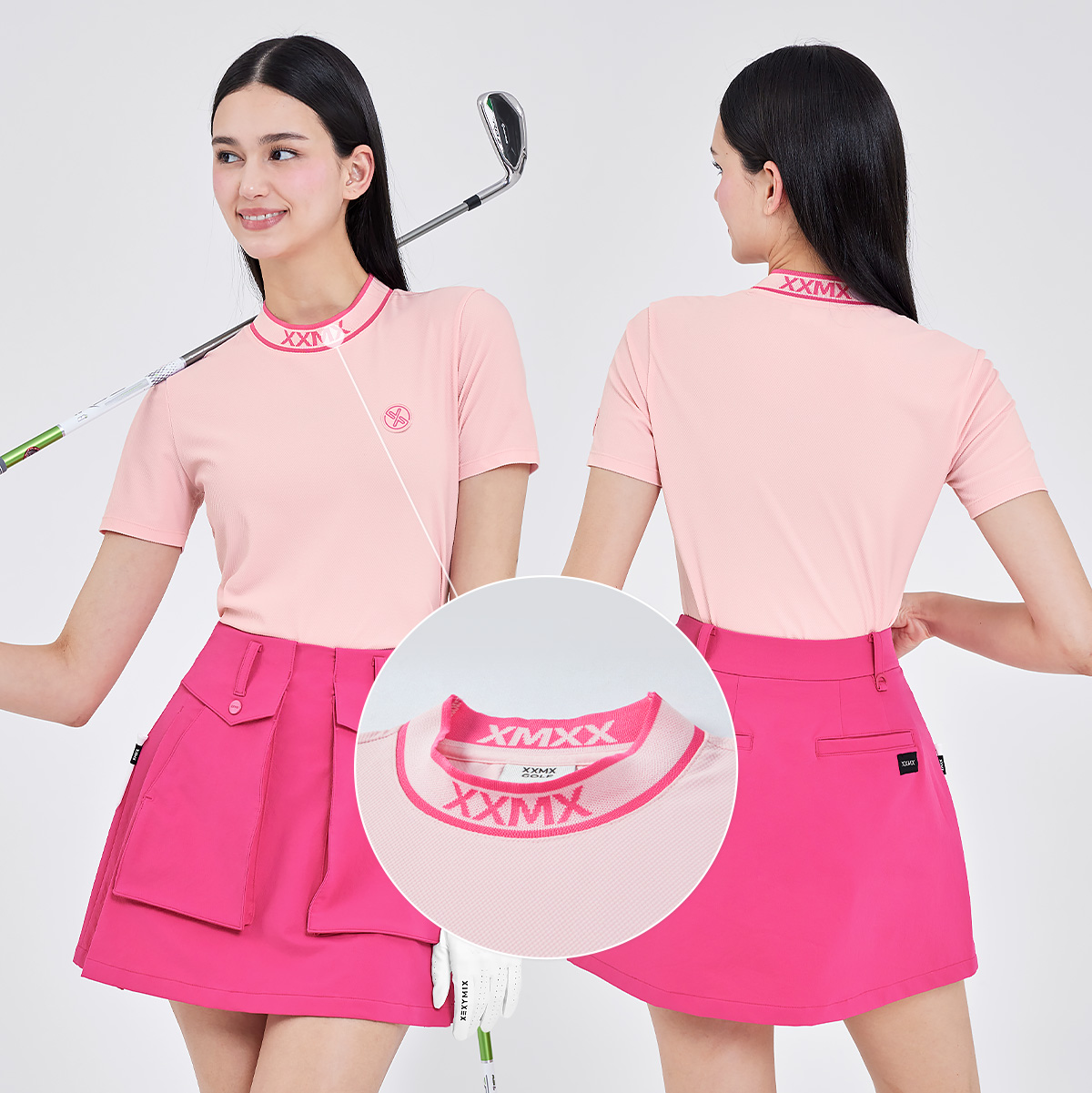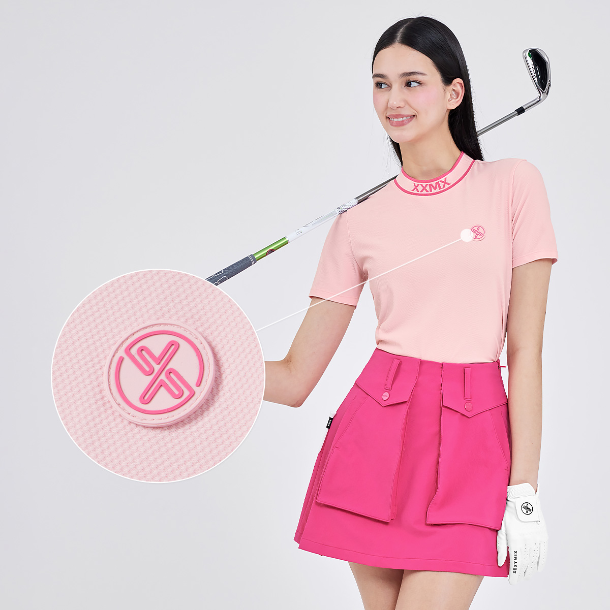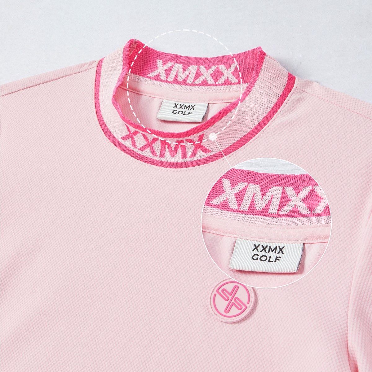 젝시믹스의 이유 있는 자부심, 좌측 가슴에 젝시믹스 골프 원형 심볼 와펜을 넣어 브랜드의 아이덴티티를 포인트 있게 보여줬어요. FABRIC INFO