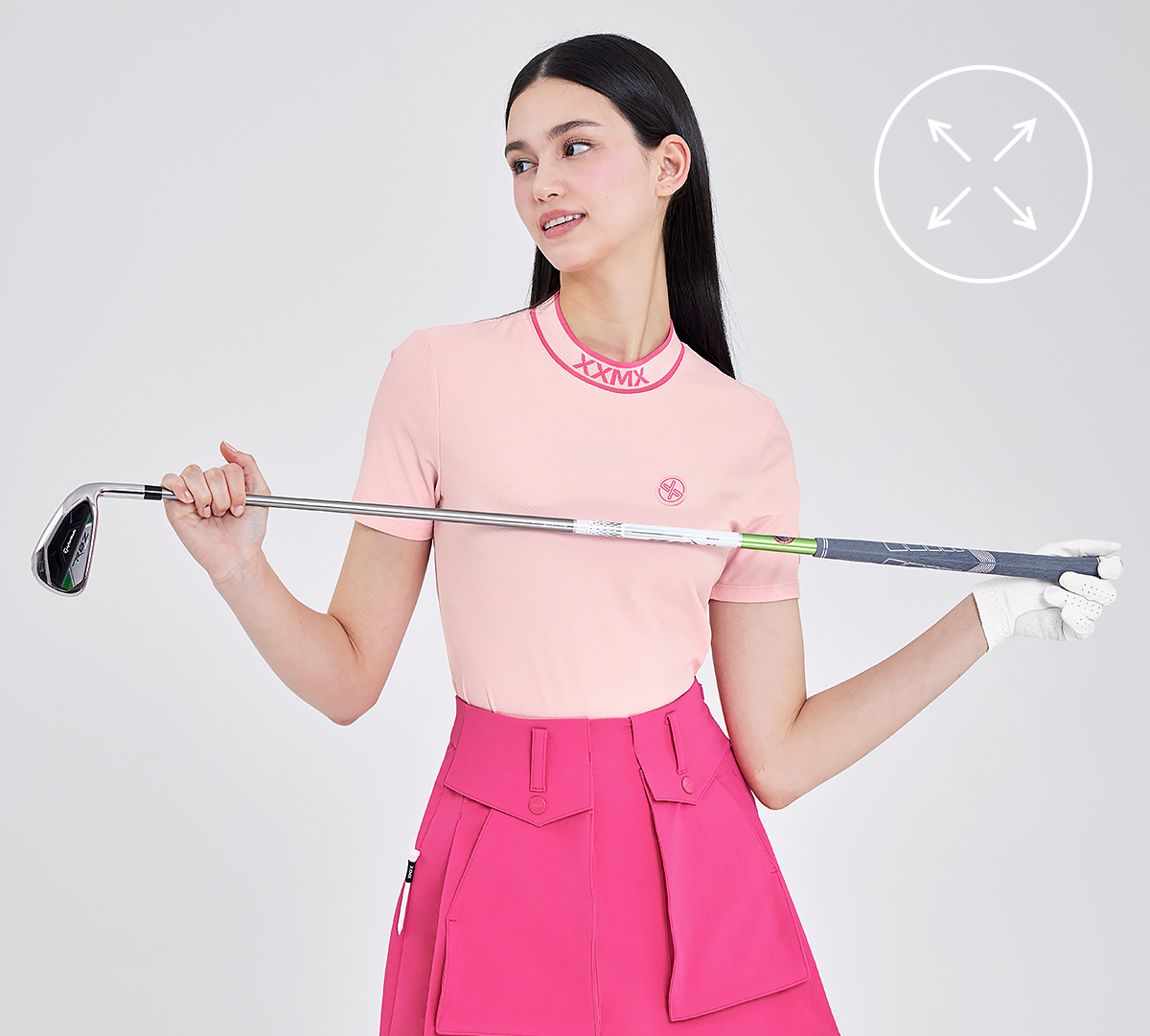모든 움직임을 편안하게 서포트하는 넥 라인을 부드럽게 감싸주는 안정적인 착용감과 유연하게 늘어나는 스트레치 소재로 더욱 편안한 라운딩 DESIGN POINT