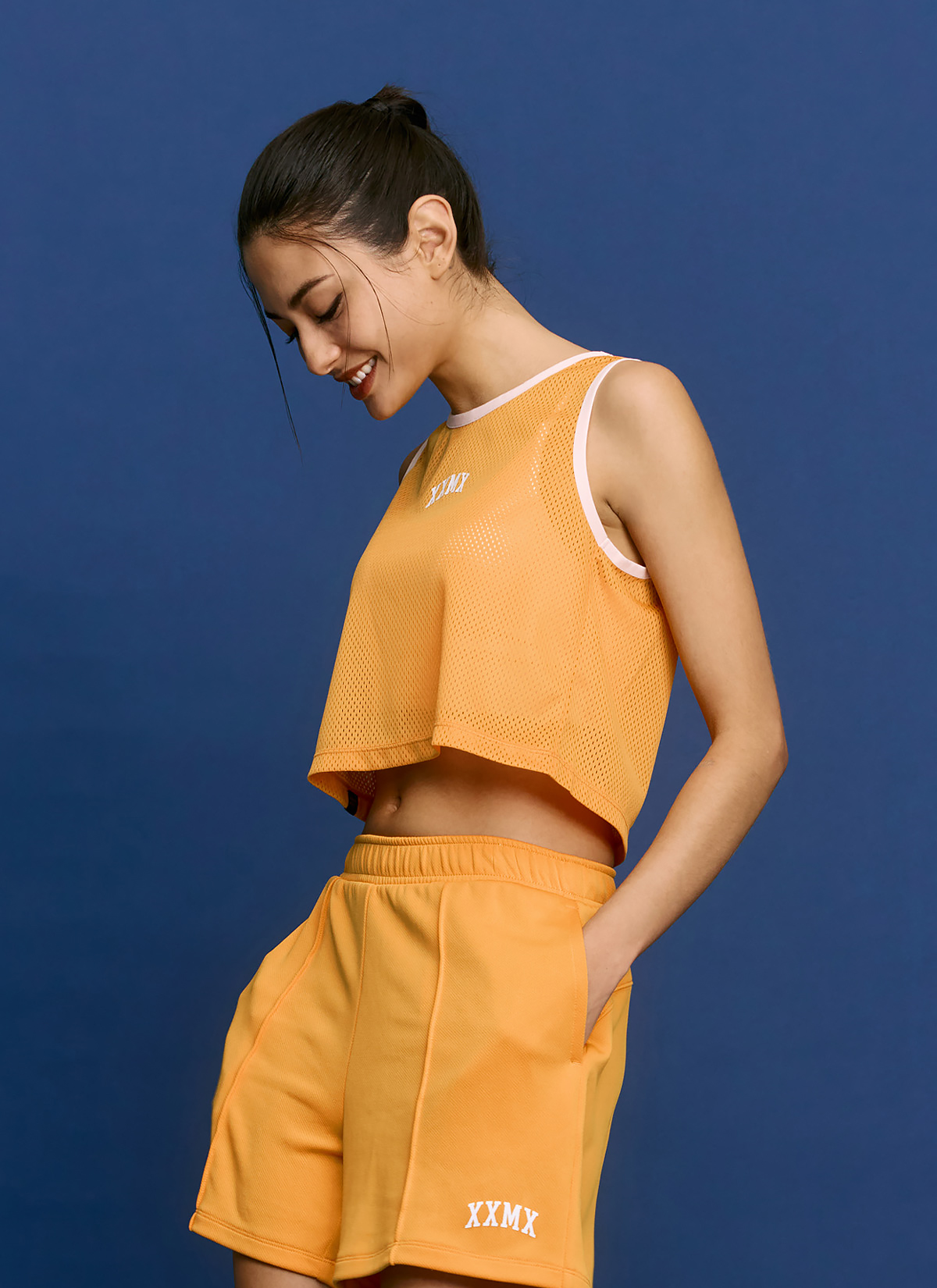 "쉿! 남다른 비율의 비결이에요." 가장 잘록한 허리선 아래로 떨어지는 적당한 크롭 기장으로 노출 부담이 적으며, 레그 라인이 길어 보이는 효과를 줘요.