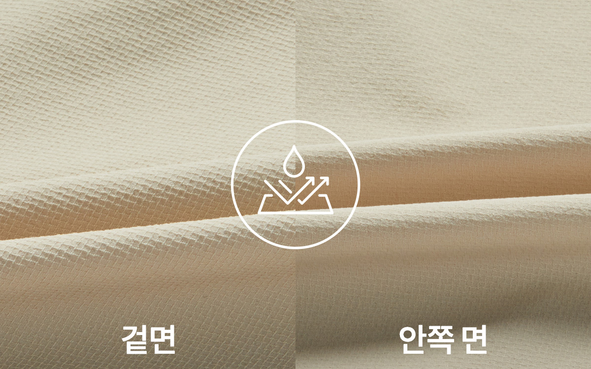 독특한 외관과 가슬가슬한 텍스처를 구현한 조직 변형 우븐 소재로, 땀을 흘려도 피부에 달라붙지 않아 쾌적한 착용감을 선사해요.