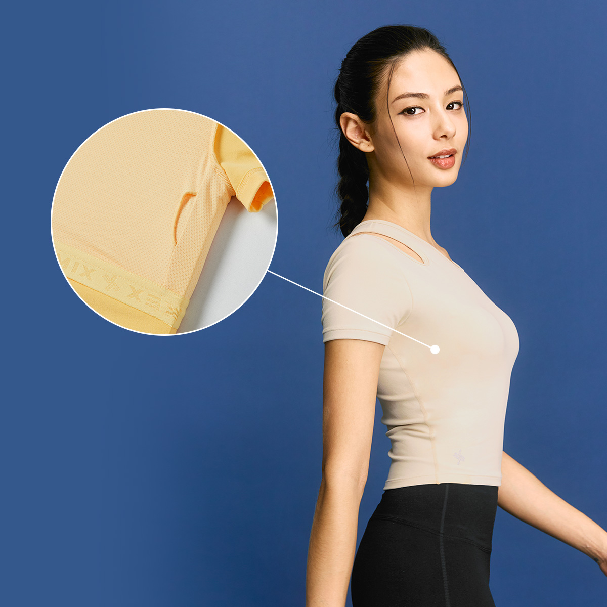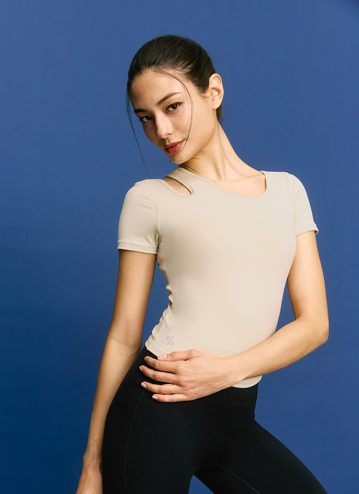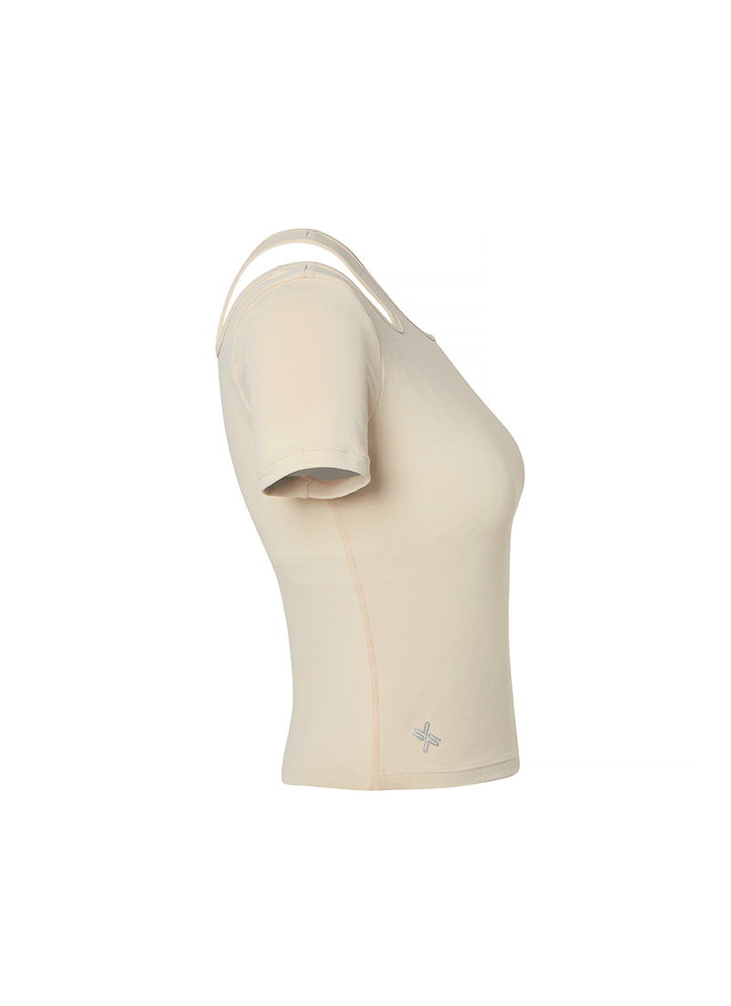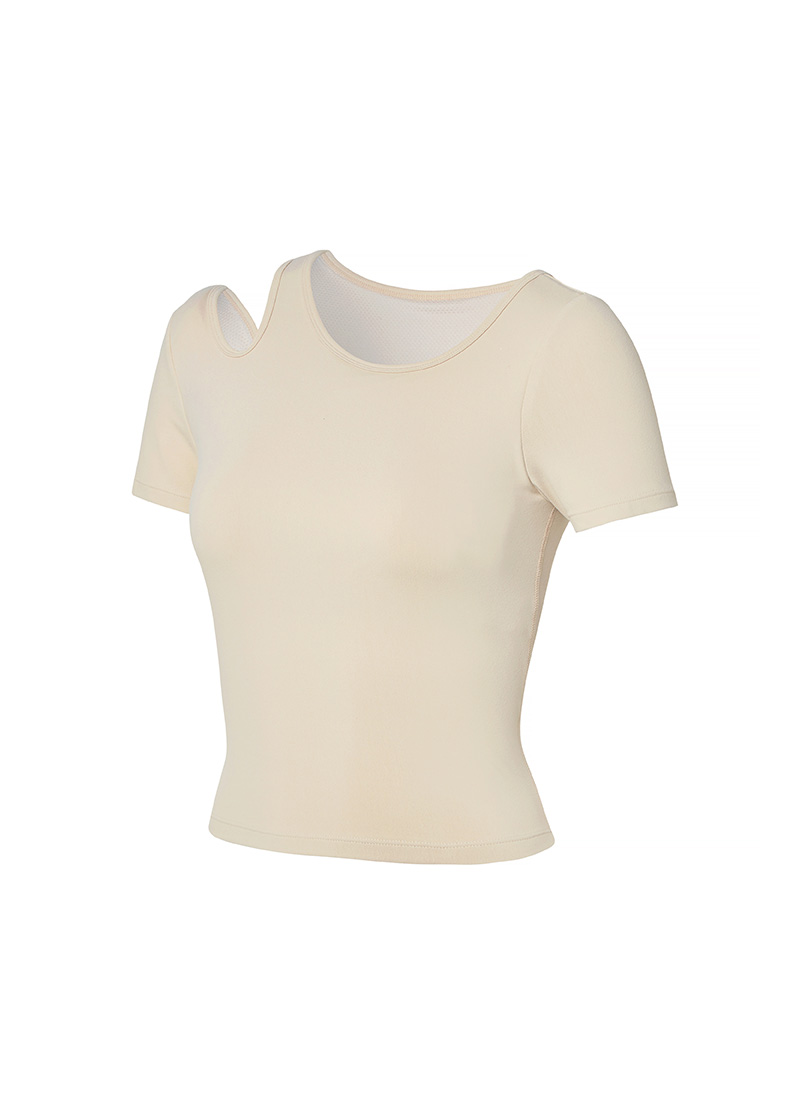 02 "어느 각도에서 봐도 시선 집중!" 한쪽 어깨 라인에 라운드형 컷아웃 디테일로 포인트를 주어 트렌디한 분위기를 더해줄 뿐만 아니라 상체의 가동범위도 넓혀줘요.