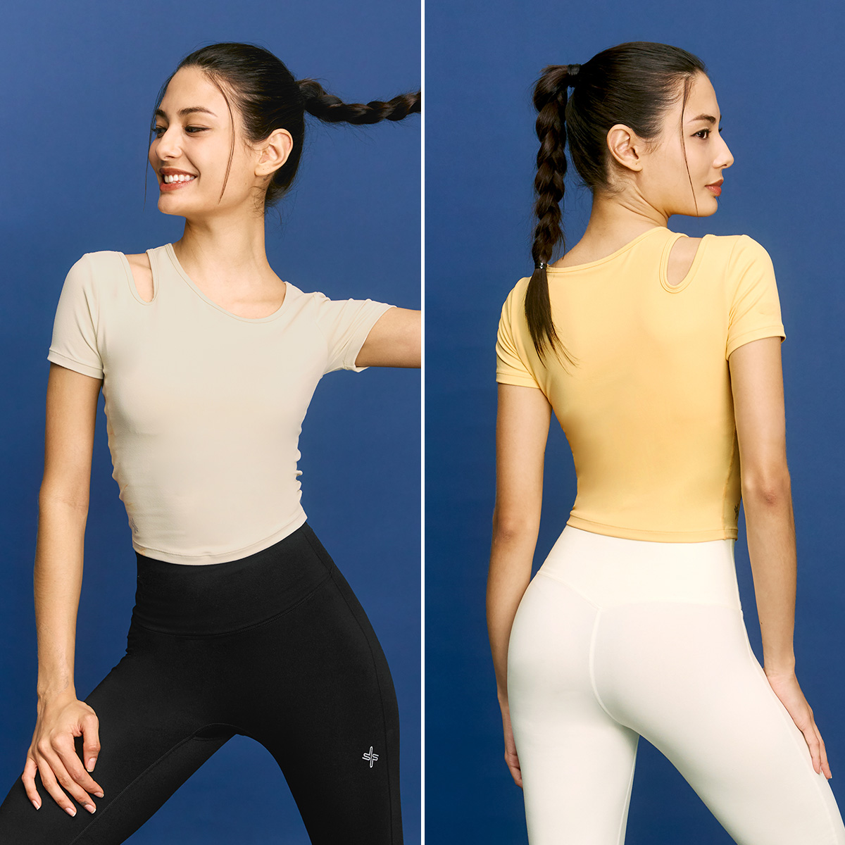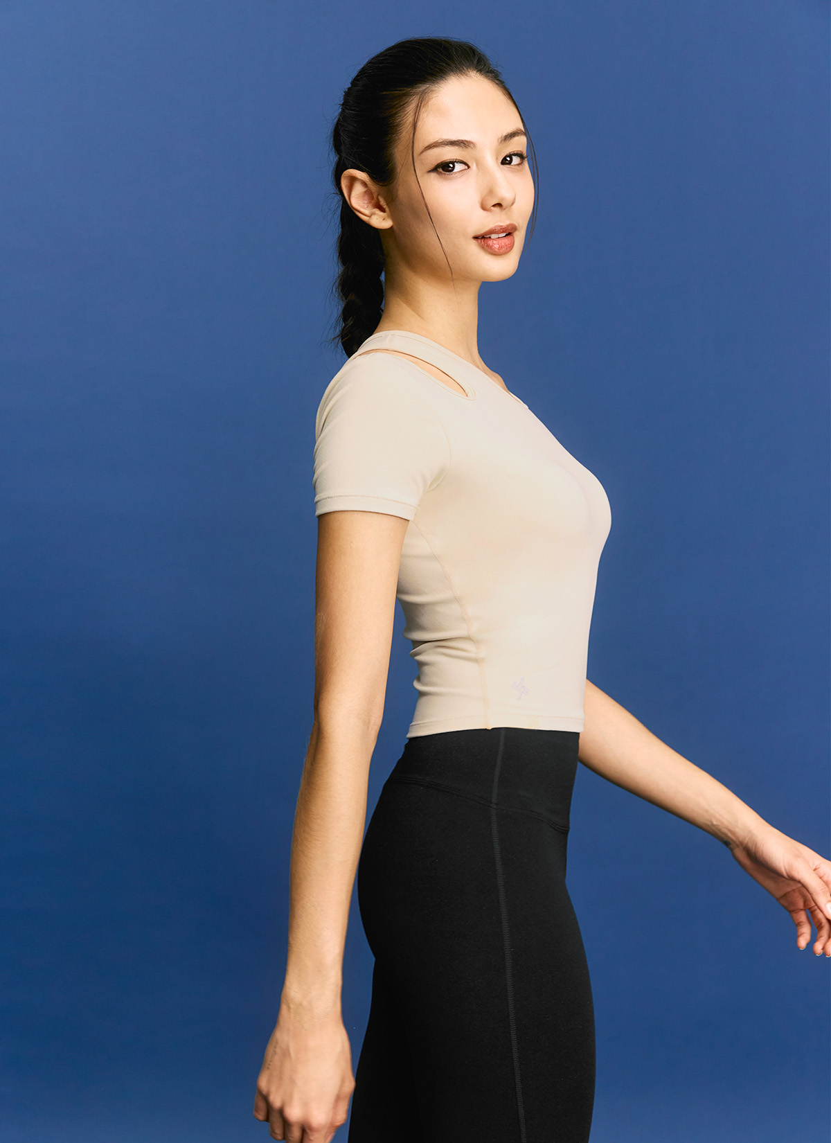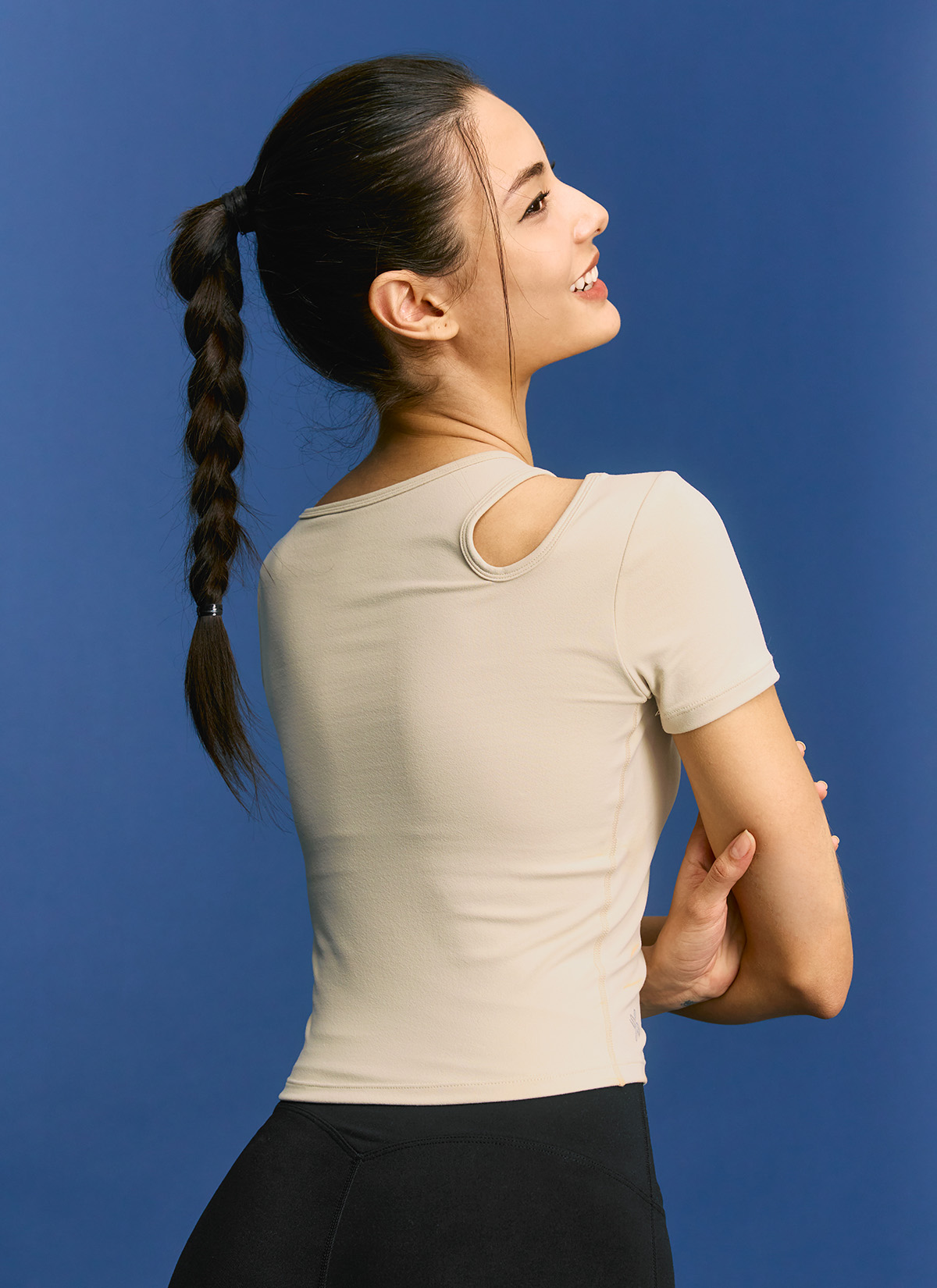 02 "어느 각도에서 봐도 시선 집중!" 한쪽 어깨 라인에 라운드형 컷아웃 디테일로 포인트를 주어 트렌디한 분위기를 더해줄 뿐만 아니라 상체의 가동범위도 넓혀줘요.