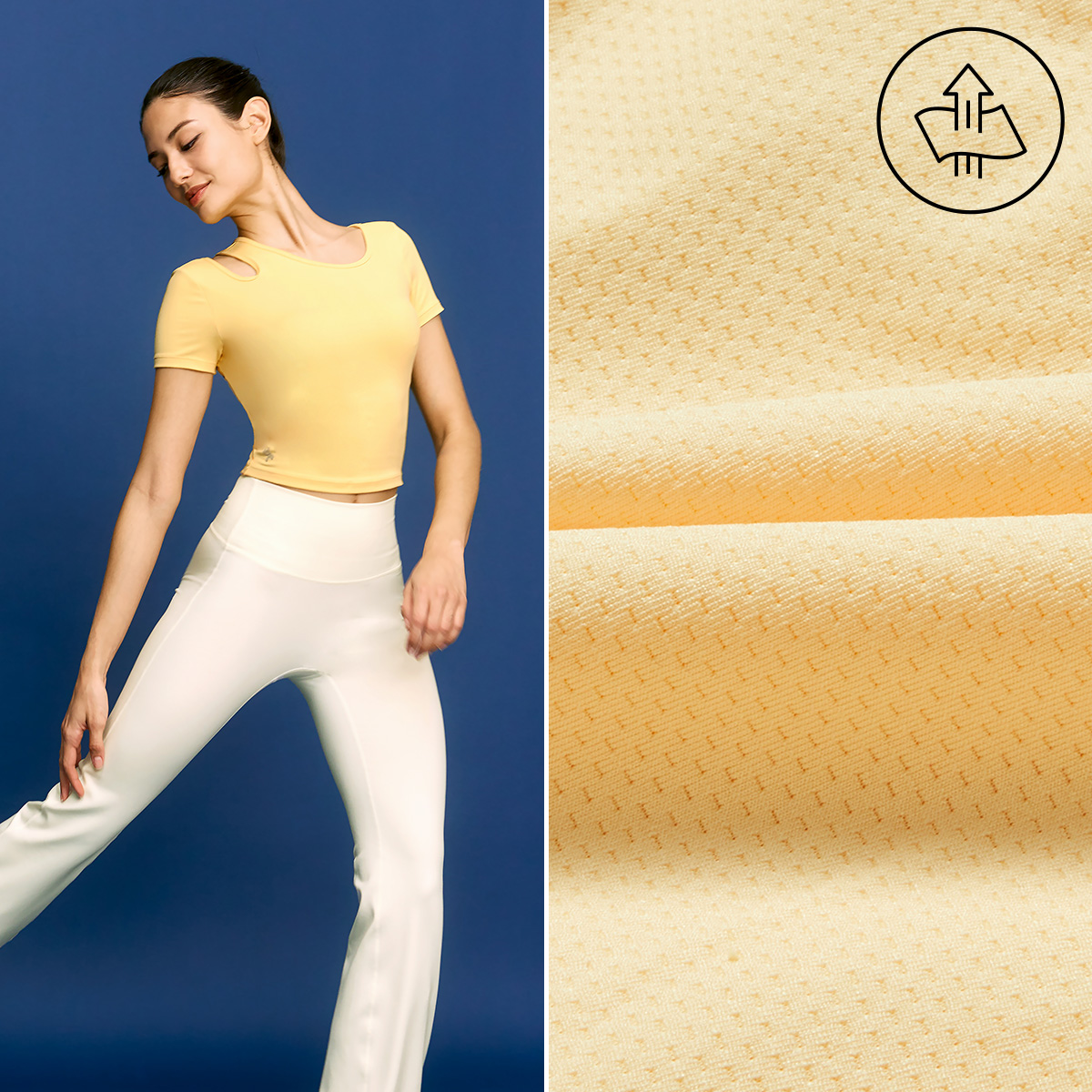 02 쭉쭉 늘어나는 스트레치, 신축성과 복원력이 뛰어난 폴리우레탄 원사를 혼방하여 다양한 액티브 활동 시 움직임을 편안하게 서포트해 줘요.