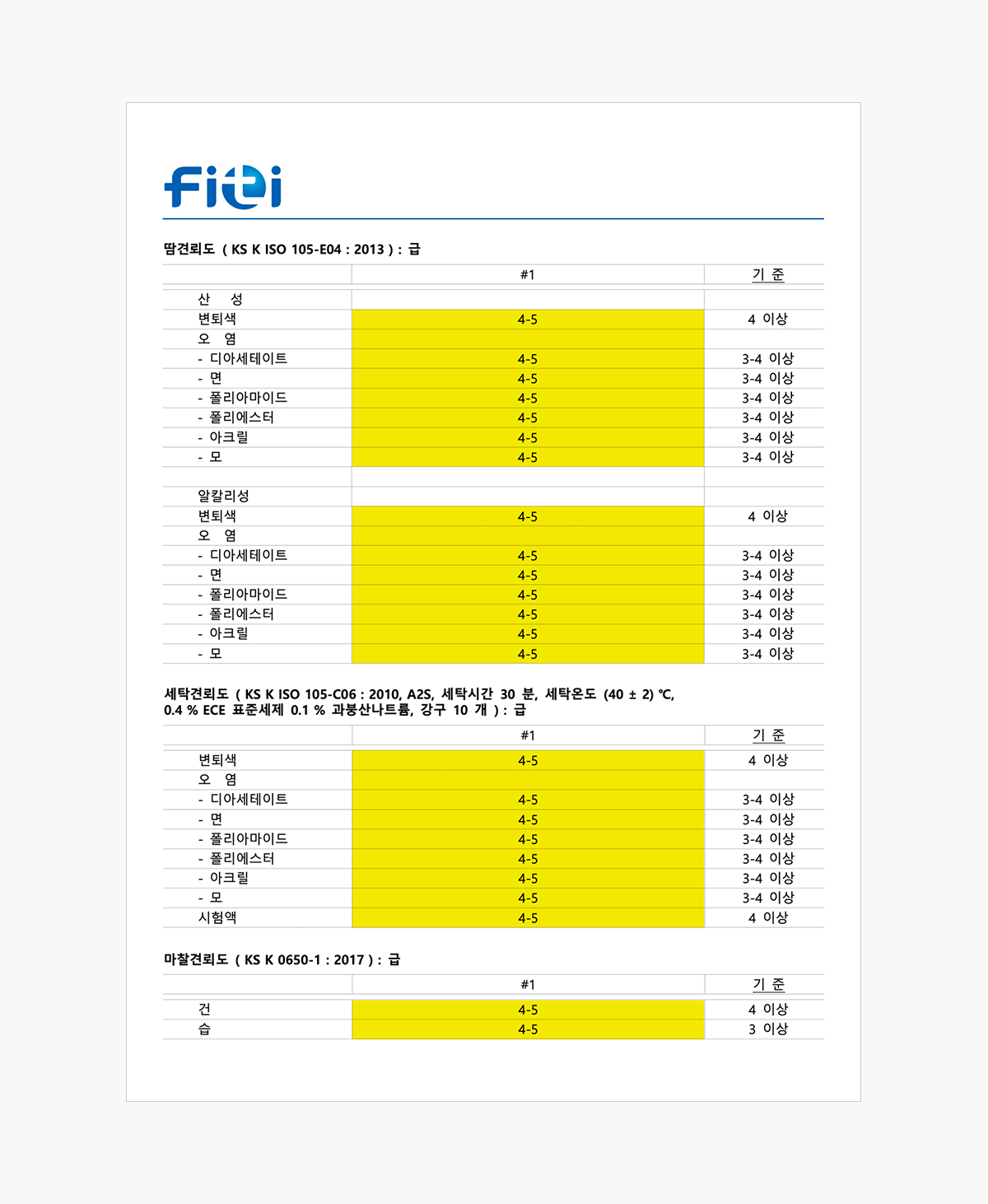 * FITI 시험연구원의 땀, 세탁, 마찰견뢰도 테스트 완료