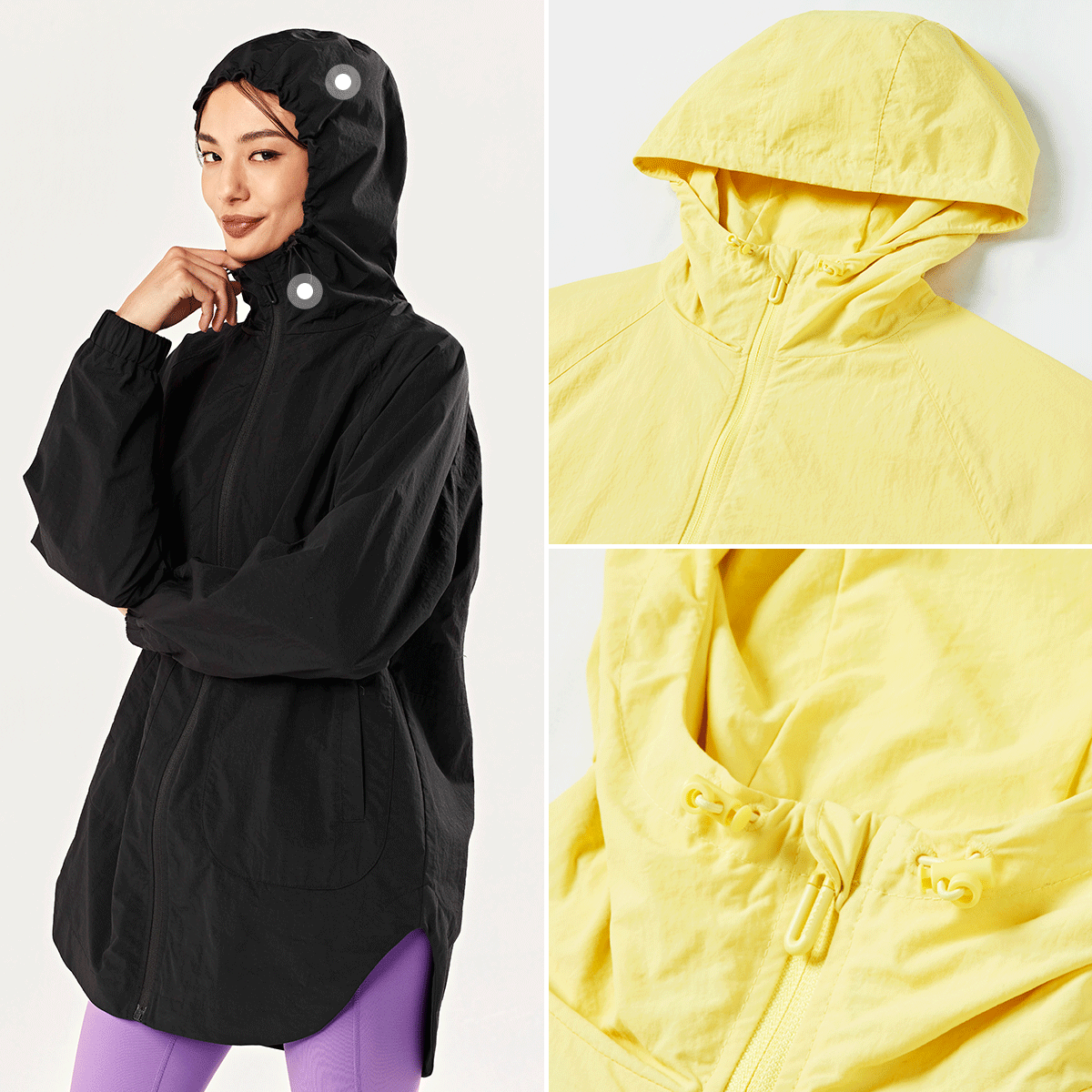 "갑자기 바람이 불어도 두상을 안정적으로 감싸주는 후드가 방풍 효과를 높여주며, 후드 입구에 내장된 스트링으로 핏을 조절해 입을 수 있어요.