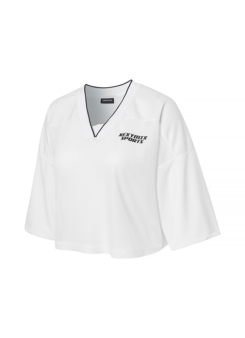 역동적인 움직임에도 들뜸 없이- 목선이 돋보이는 브이 넥 라인에 탄탄한 플랫 니트 디테일을 더해 안정적인 착용감을 주며, 핀 배색 포인트로 스포티한 무드를 강조했어요.