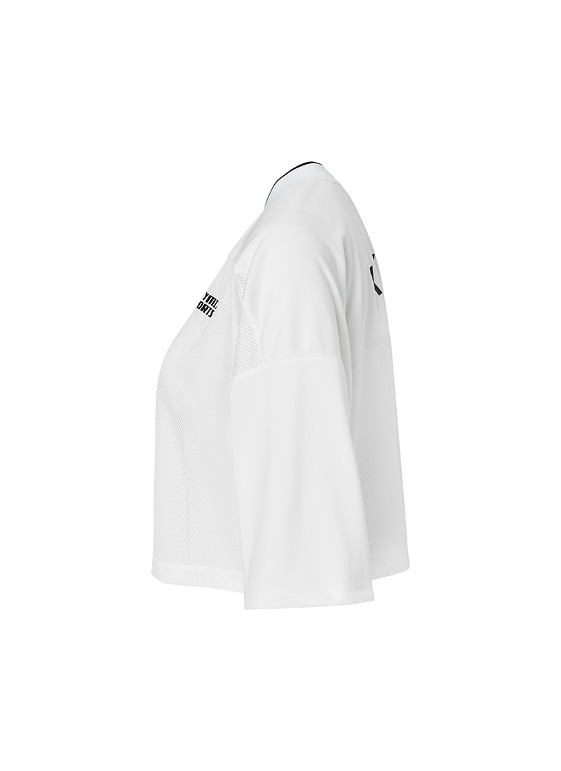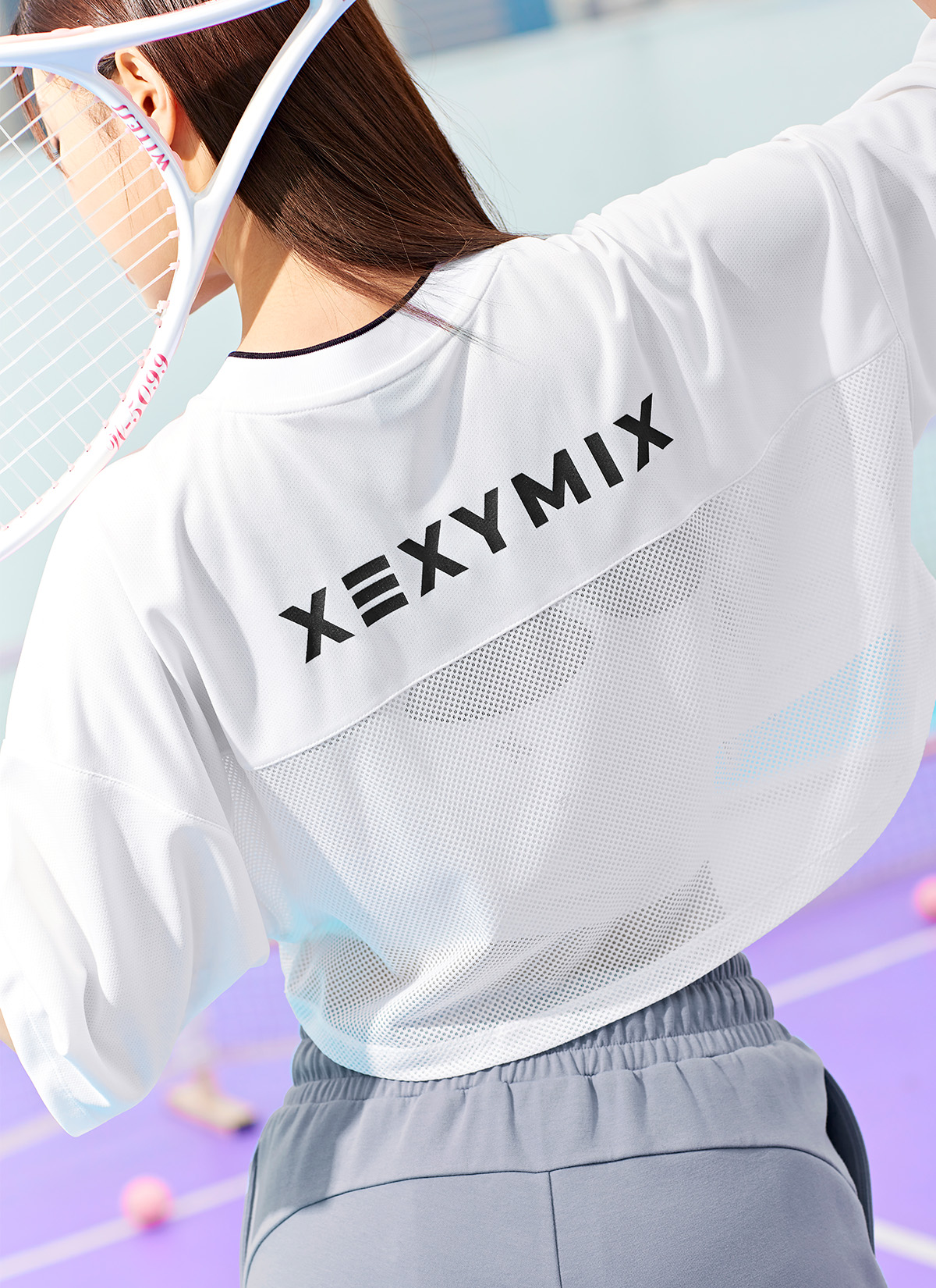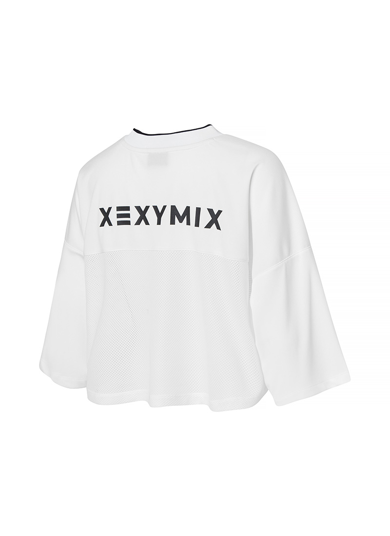 브라 탑만 입기 부담스러울 때, 몸판 앞·뒷면의 요크 절개선 아래로 메쉬 소재를 믹스 배치하여 은은한 비침 효과를 주어 브라 탑 위에 가볍게 레이어링하기 좋아요.