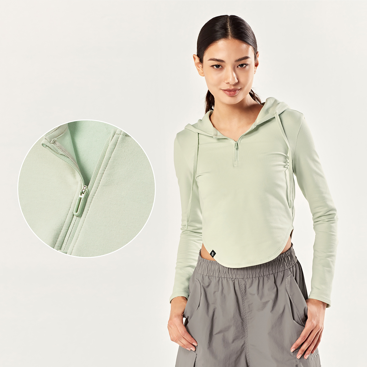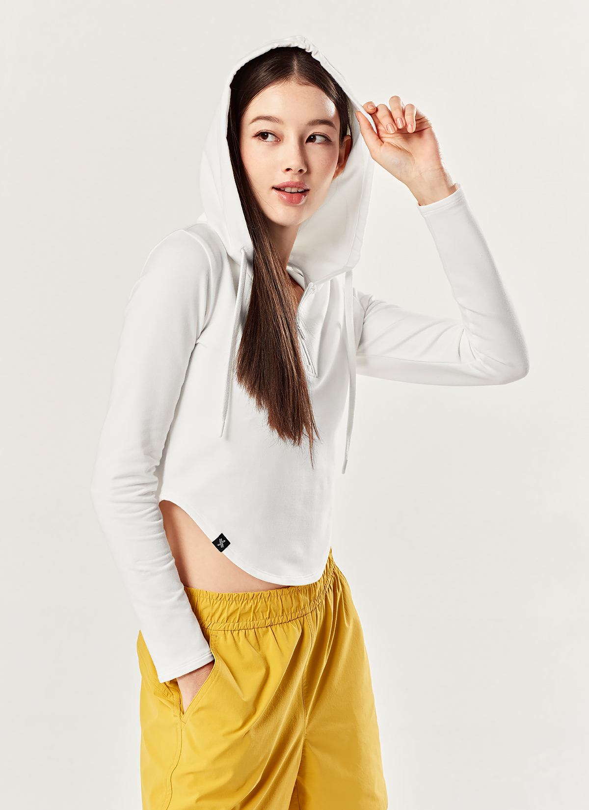 03 "가볍게 쓱! 입을 수 있어요." 넥 라인의 하프 집업 디테일로 입고 벗기가 간편하며, 여밈 정도에 따라 다양한 연출이 가능해요.