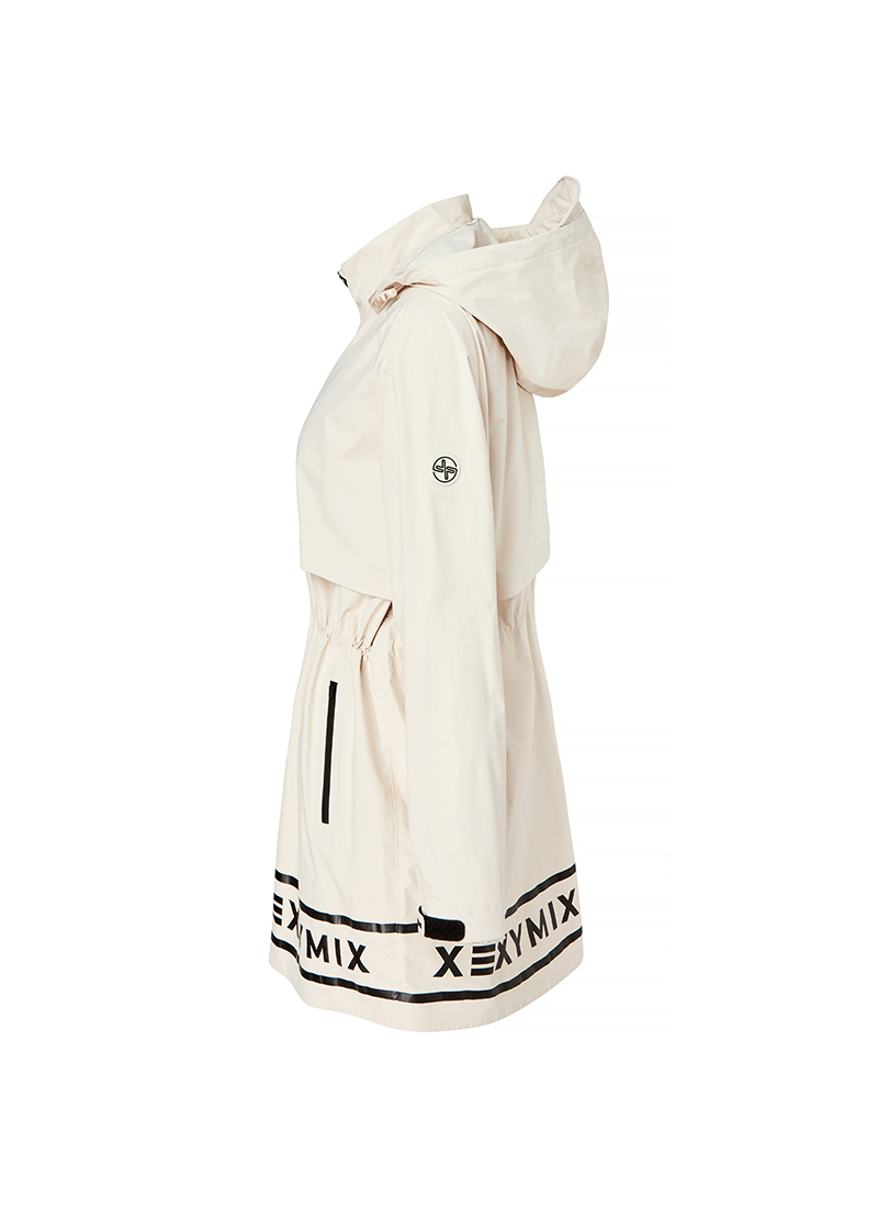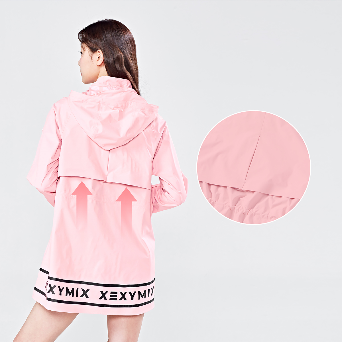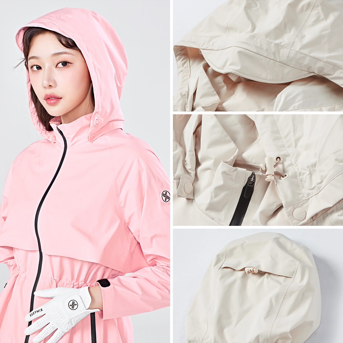 02 비가 와도 안정적인 시야 확보, 후드에 챙 디테일을 더해 우천 시 시야를 안정감 있게 확보해 주고, 후드 입구와 후면에 스트링을 삽입해 두상에 맞게 핏 조절이 가능해요.