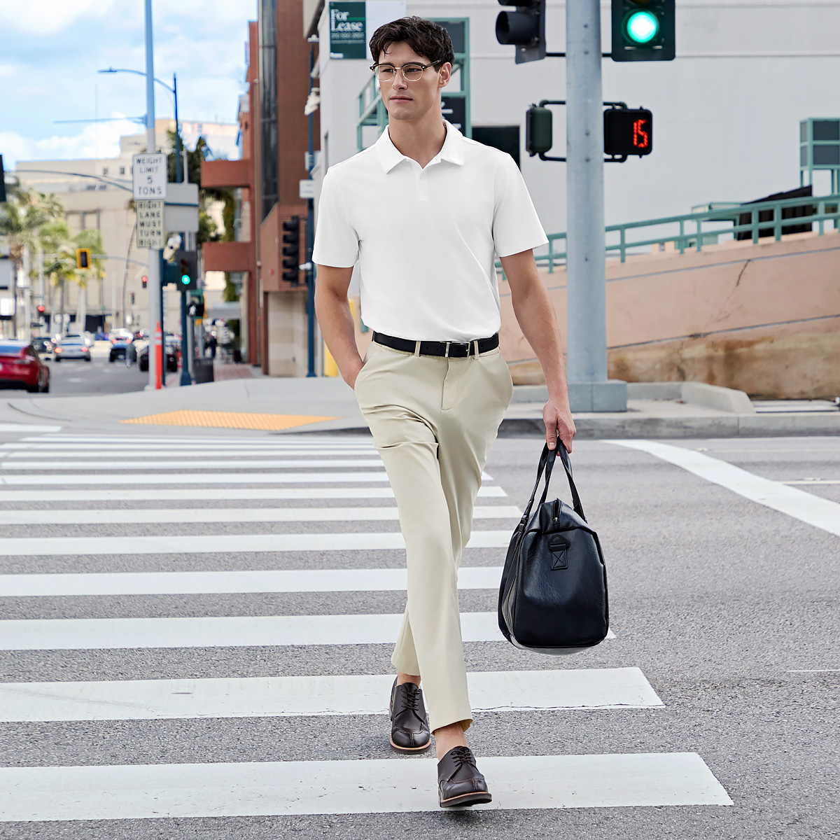 03 "격식 있는 자리도, 라운딩도 문제 없죠!" 비즈니스 룩에 꼭 필요한 벨트 고리를 더해 벨트 연출이 가능하며, 출근 룩부터 라운딩 룩까지 포멀하게 즐길 수 있어요.