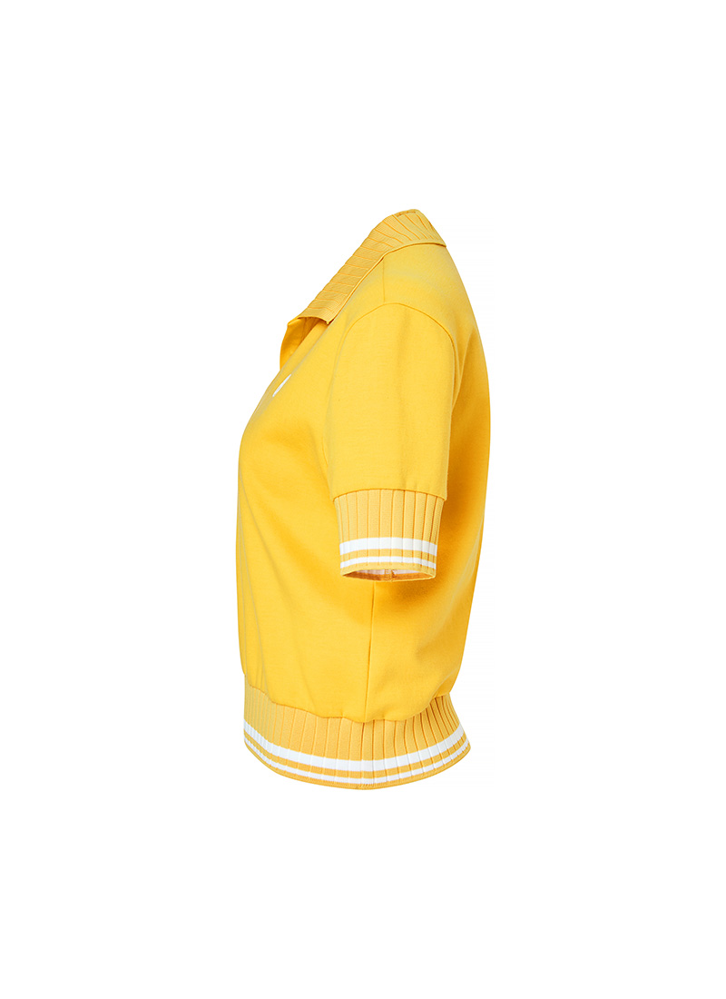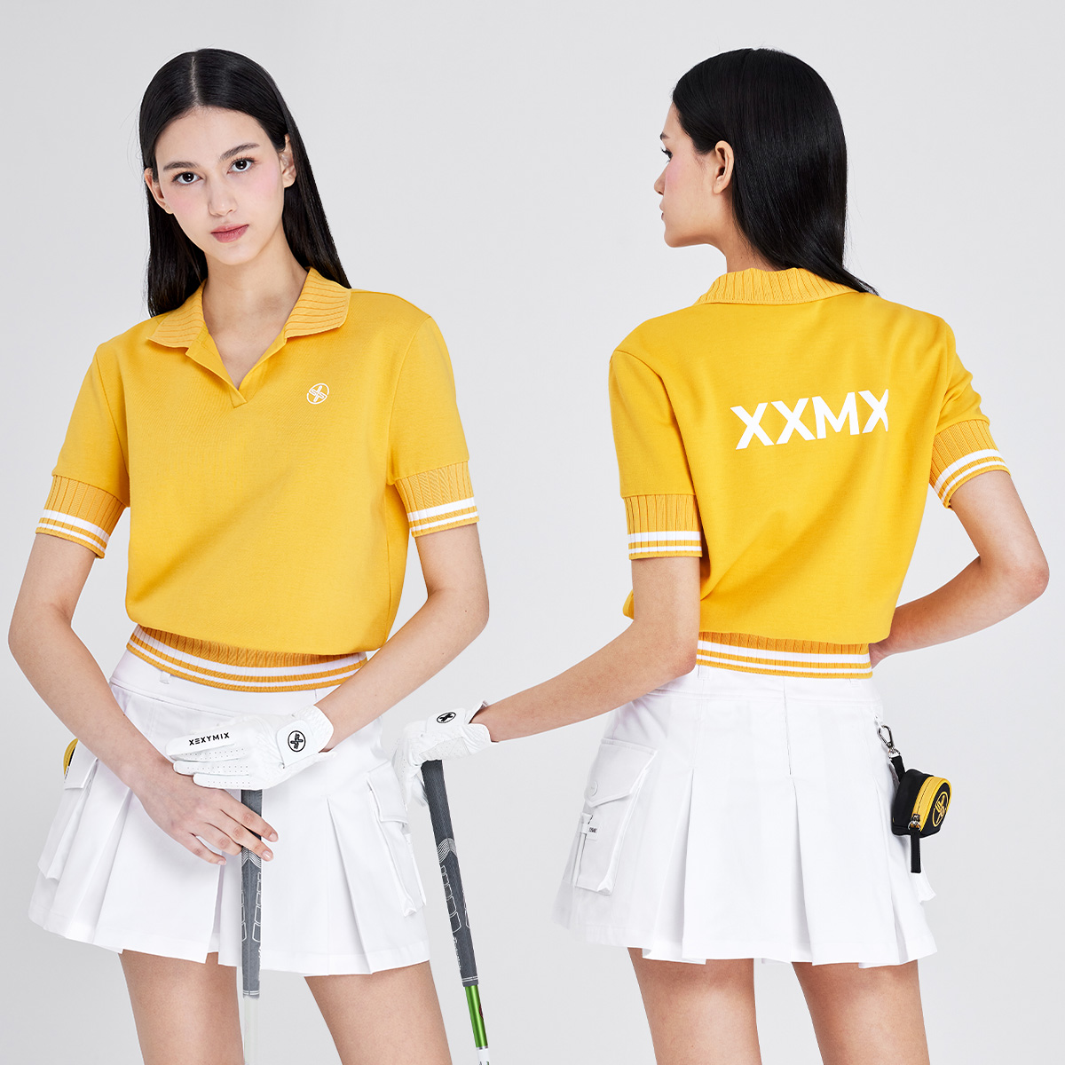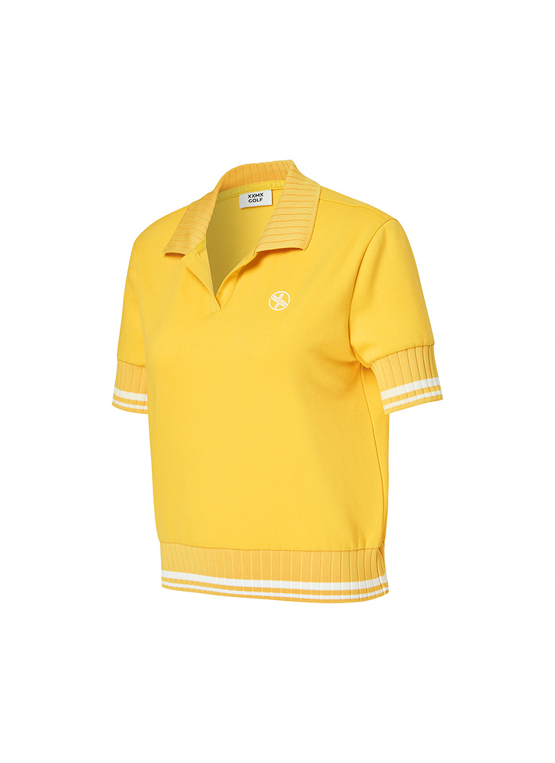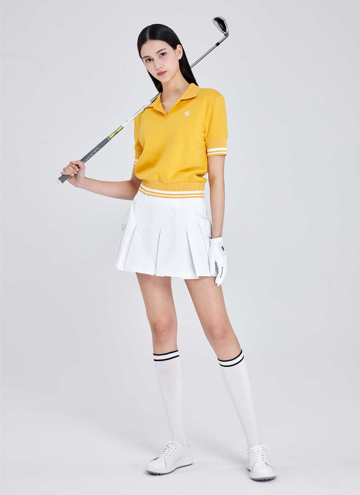 01 그린 위 스타일 지수 UP! 브이 넥 형태의 오픈 칼라 디자인이 시원하고 산뜻한 무드를 더해줘요. 넥 라인 안쪽은 로고 테이프로 마감하여 늘어짐을 최소화했어요.