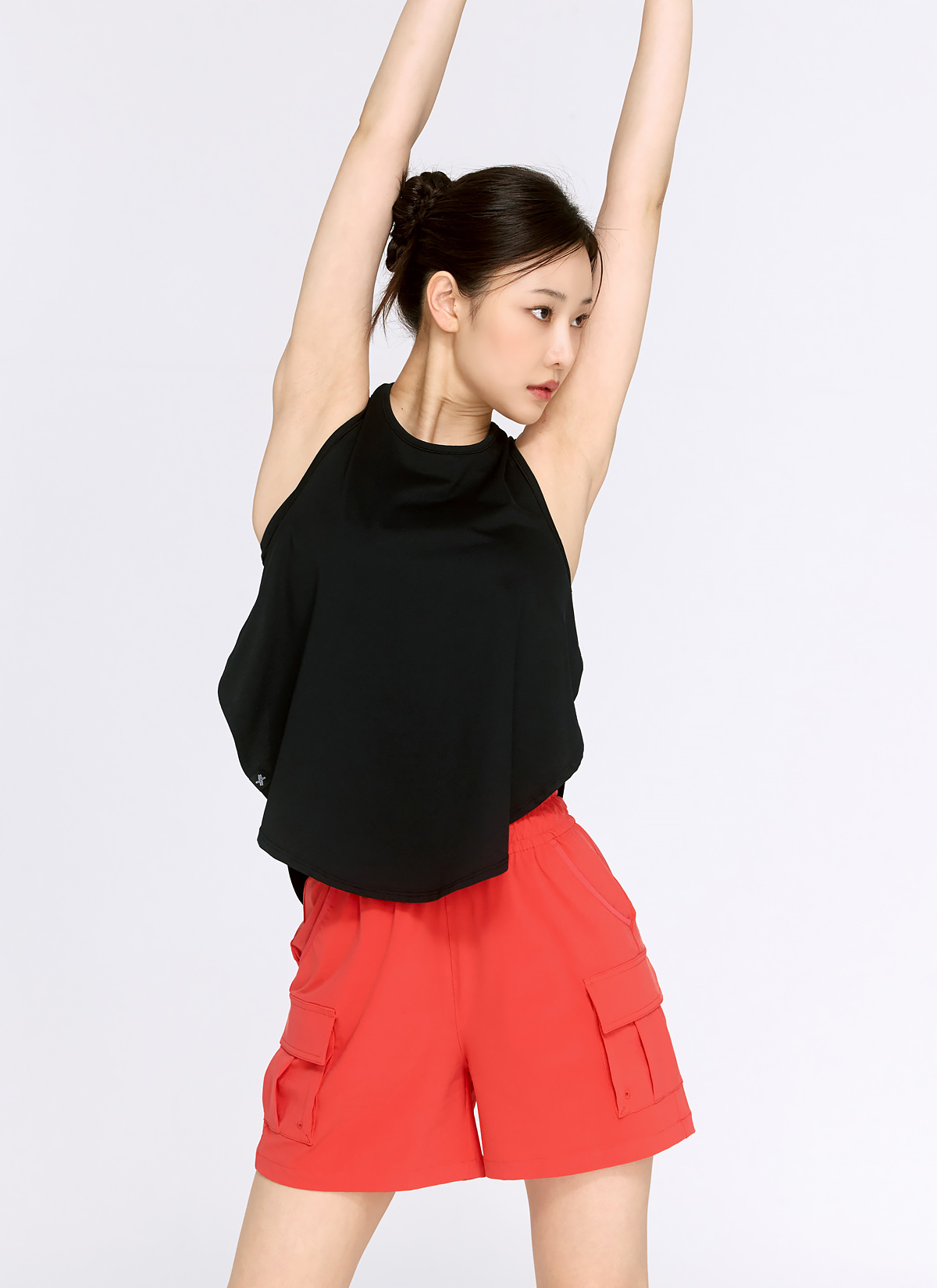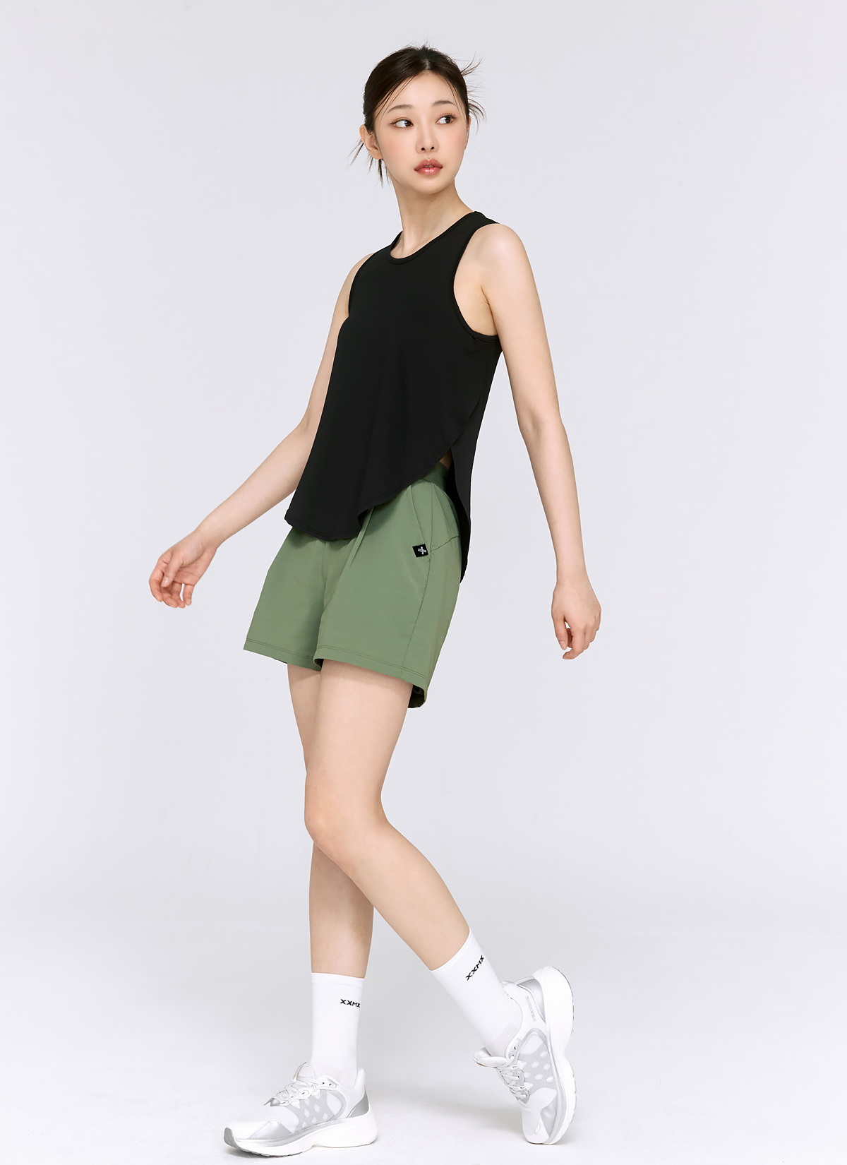 03 자유로운 퍼포먼스의 비결, 양쪽 사이드의 오버랩 디테일이 여성스러운 무드를 더해주고, 옆선 트임 효과로 퍼포먼스 시 활동성을 높여줘요.