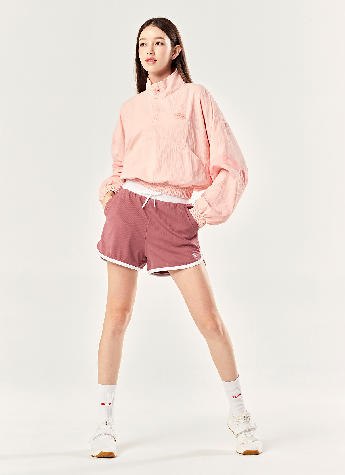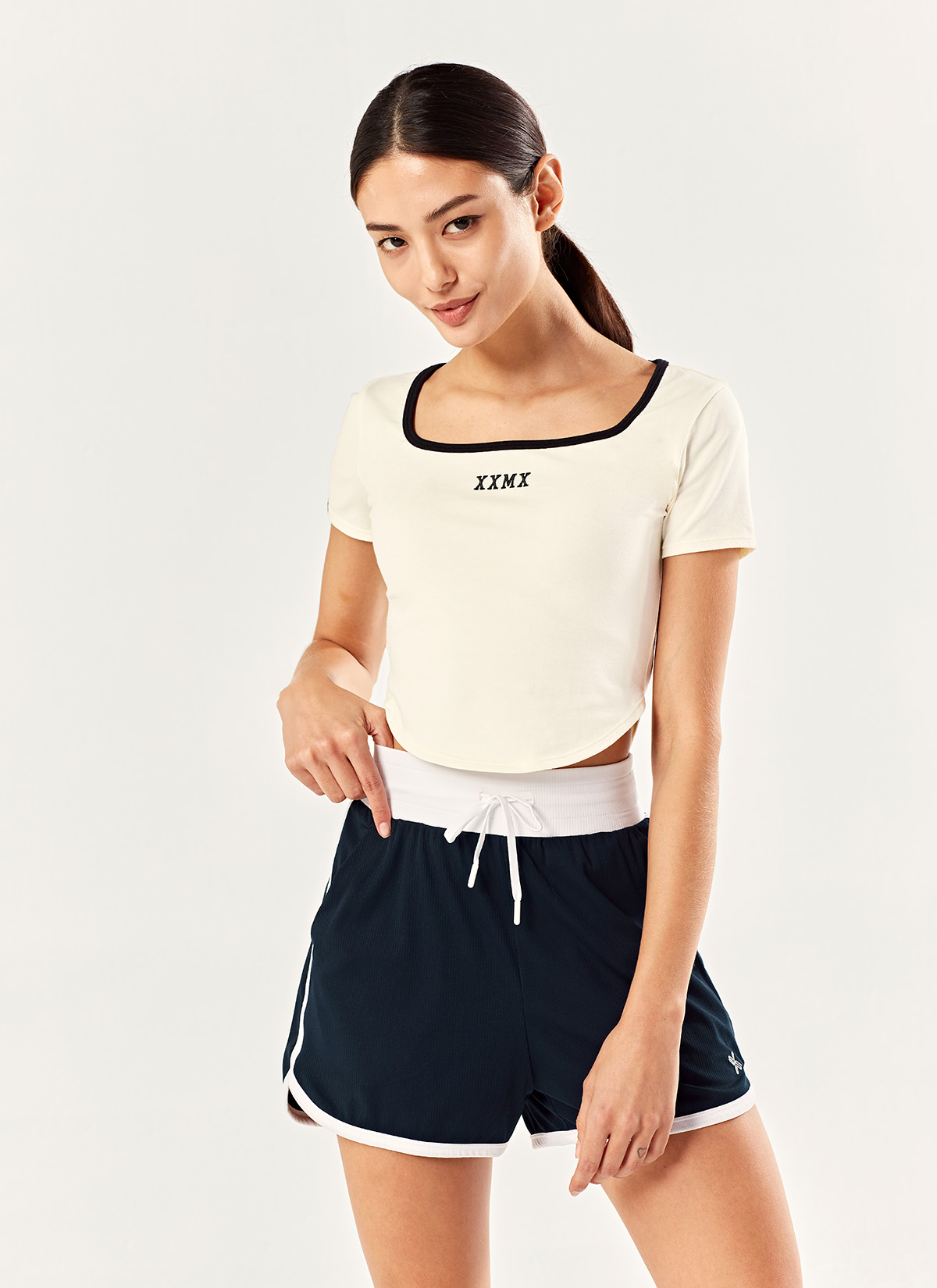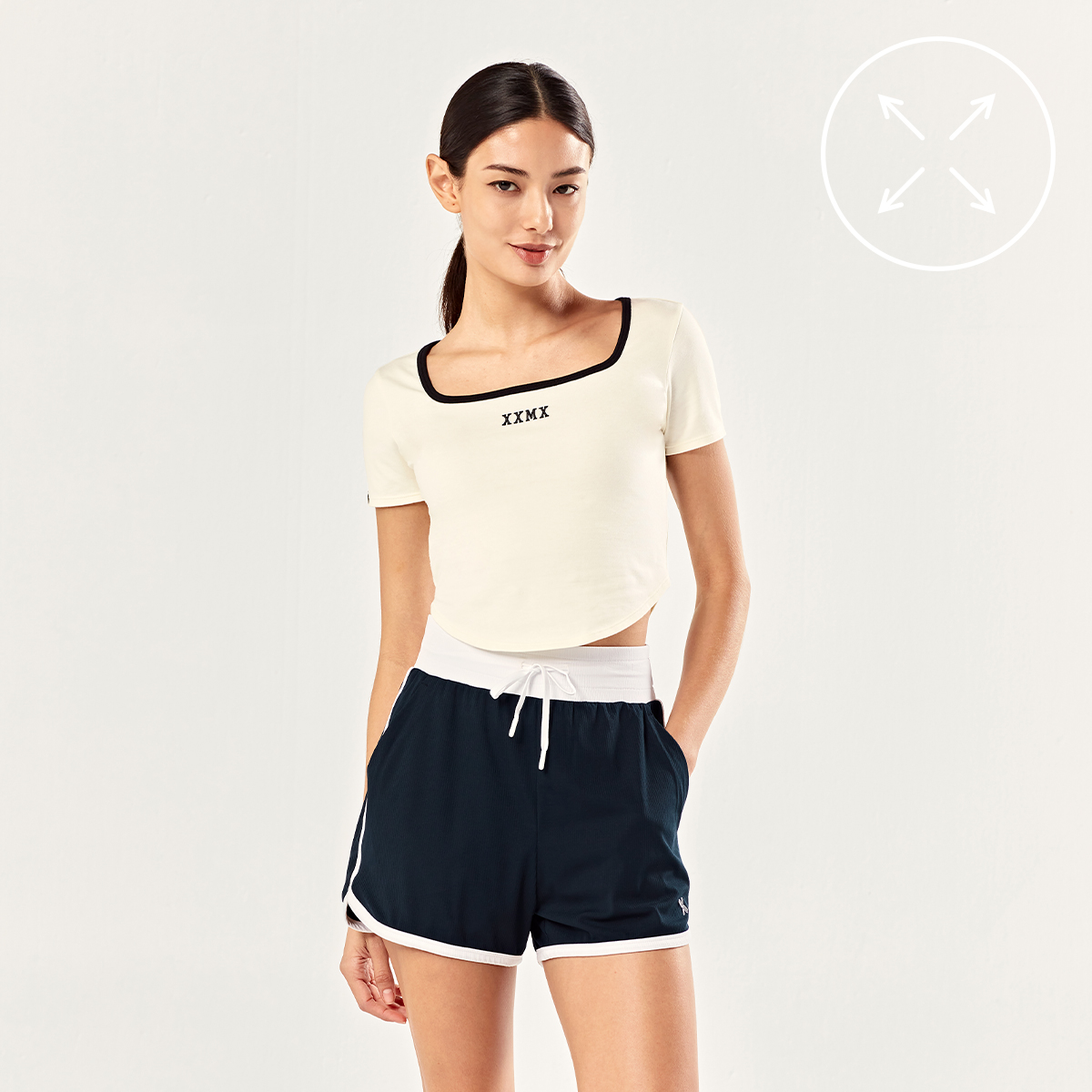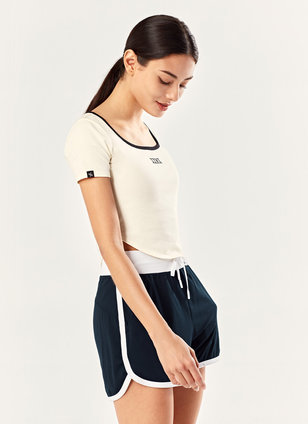 02 스포티 무드를 더해주는 허리 밴드와 사이드, 밑단 라인에 화이트 컬러 배색을 더해 액티브하고 스포티한 분위기를 강조해 줘요.