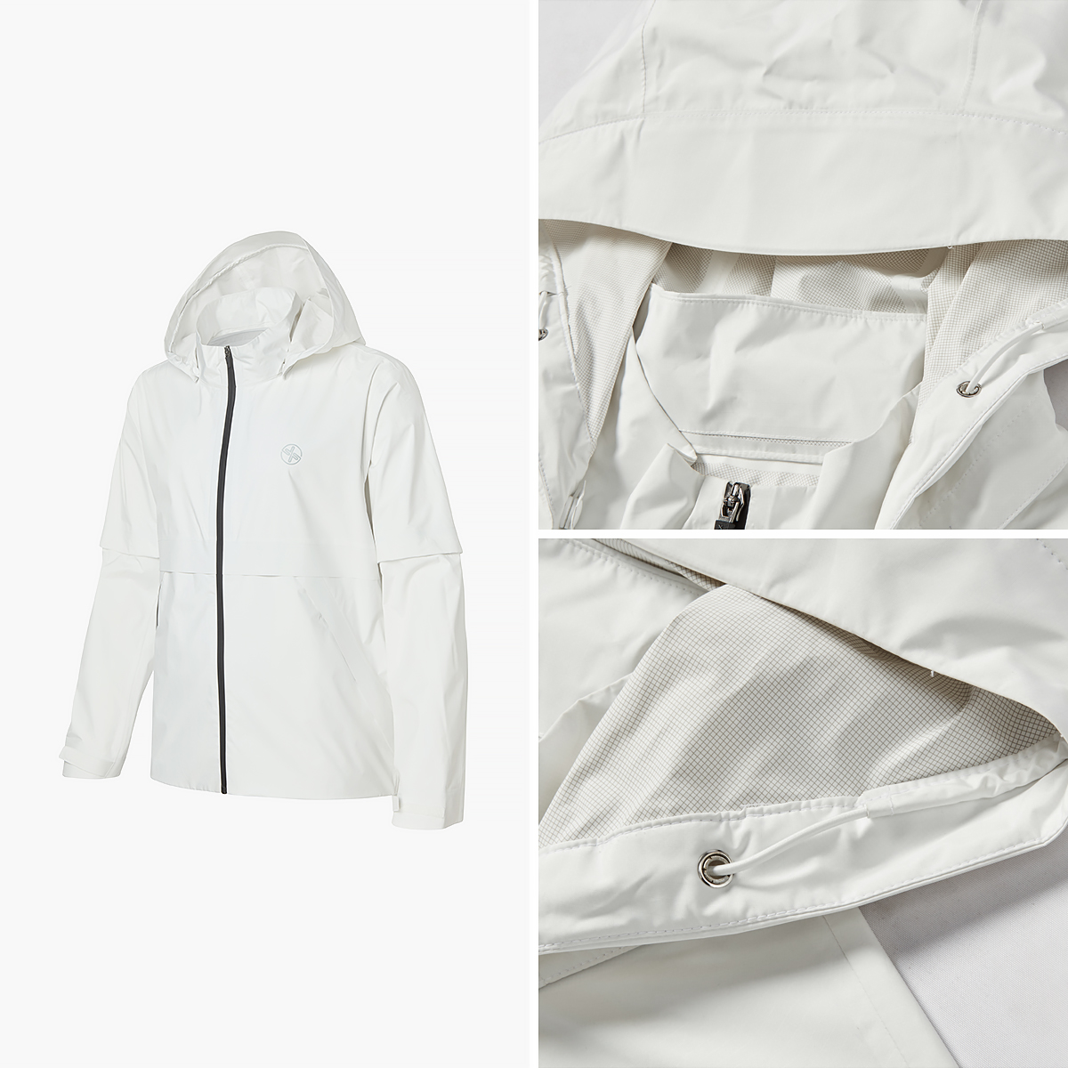 03 "시시때때로 바뀌는 날씨도 걱정 없죠!" 스냅 버튼과 지퍼로 간편하게 탈부착 가능한 후드 디자인으로, 날씨나 스타일링에 따라 투웨이로 연출할 수 있어요.
