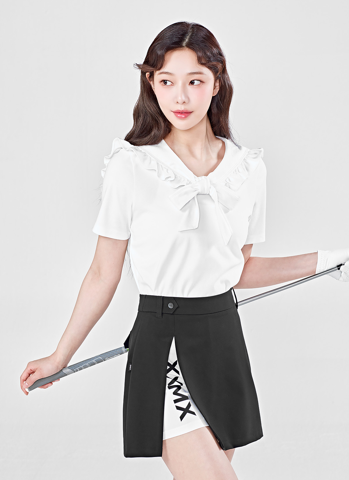 02 "이너 쇼츠가 있어 안심이죠!” 스커트 안쪽에 이너 쇼츠가 결합된 투인원 스타일로, 스윙 동작이나 카트 착석 시 노출 부담을 줄여줘요. 움직일 때마다 이너 쇼츠의 XXMX 로고가 보여 더욱 유니크해요.