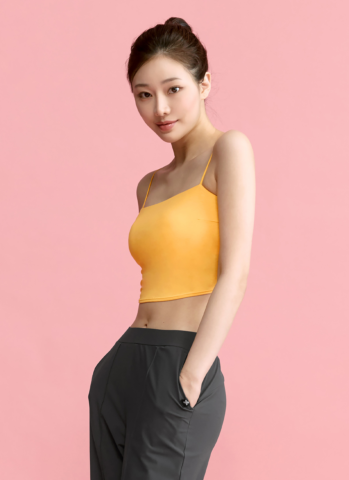 04 "쉿! 남다른 비율의 비결이에요." 가장 잘록한 허리선에 딱 맞게 떨어지는 크롭 기장으로, 밑단을 자연스러운 라운드 형태로 디자인하여 다리가 더욱 길어 보이는 워너비 핏을 연출해 줘요.